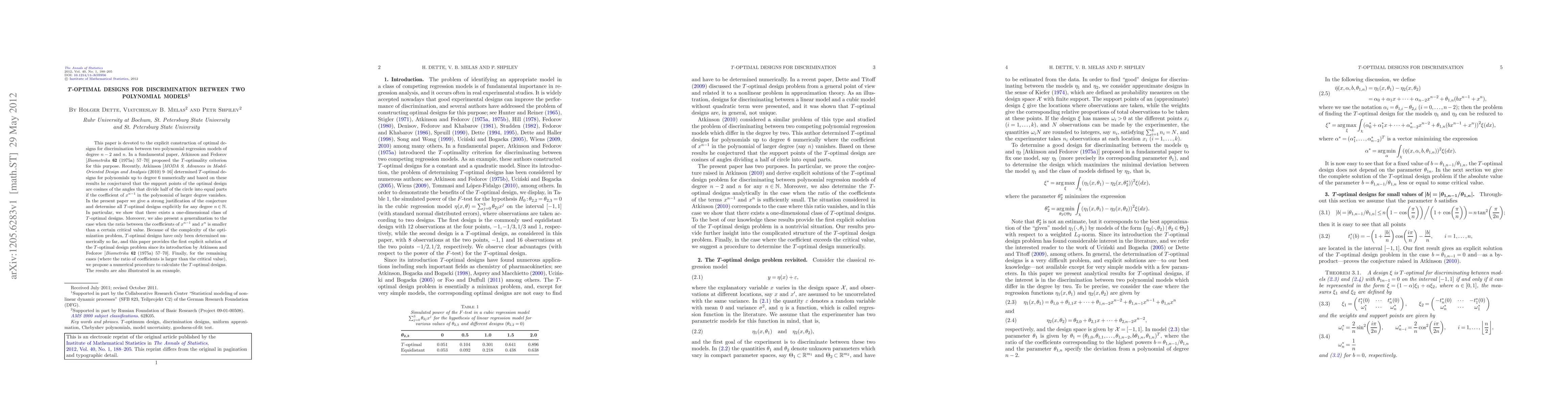 This paper is devoted to the explicit construction of optimal designs for discrimination between two polynomial regression models of degree $n-2$ and $n$. In a fundamental paper, Atkinson and Fedorov [Biometrika 62 (1975a) 57--70] proposed the $T$-optimality criterion for this purpose. Recently, Atkinson [MODA 9, Advances in Model-Oriented Design and Analysis (2010) 9--16] determined $T$-optimal designs for polynomials up to degree 6 numerically and based on these results he conjectured that the support points of the optimal design are cosines of the angles that divide half of the circle into equal parts if the coefficient of $x^{n-1}$ in the polynomial of larger degree vanishes. In the present paper we give a strong justification of the conjecture and determine all $T$-optimal designs explicitly for any degree $n\in\mathbb{N}$. In particular, we show that there exists a one-dimensional class of $T$-optimal designs. Moreover, we also present a generalization to the case when the ratio between the coefficients of $x^{n-1}$ and $x^n$ is smaller than a certain critical value. Because of the complexity of the optimization problem, $T$-optimal designs have only been determined numerically so far, and this paper provides the first explicit solution of the $T$-optimal design problem since its introduction by Atkinson and Fedorov [Biometrika 62 (1975a) 57--70]. Finally, for the remaining cases (where the ratio of coefficients is larger than the critical value), we propose a numerical procedure to calculate the $T$-optimal designs. The results are also illustrated in an example.