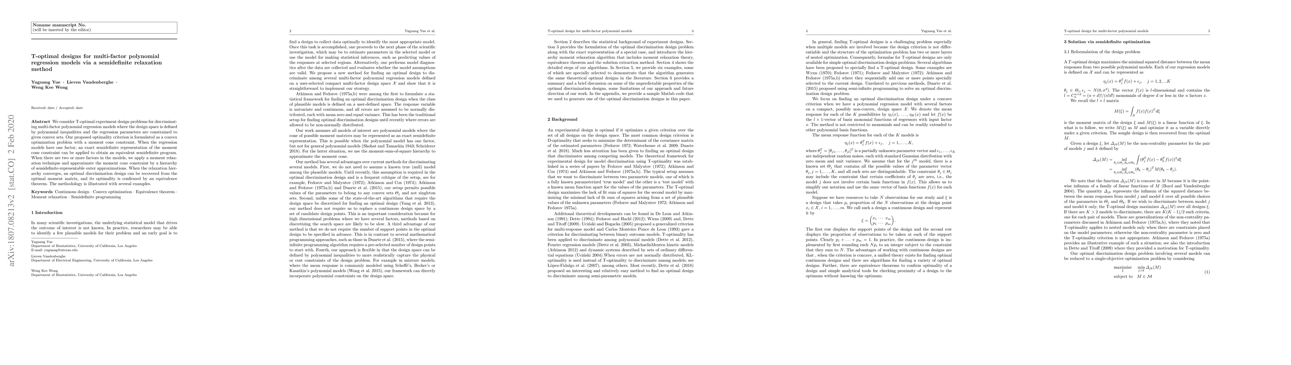 This paper proposes a semidefinite relaxation method for obtaining T-optimal designs in multi-factor polynomial regression models, using exact semidefinite programming for single-factor models and a moment relaxation technique for multiple factors. The method's effectiveness is demonstrated through various examples.