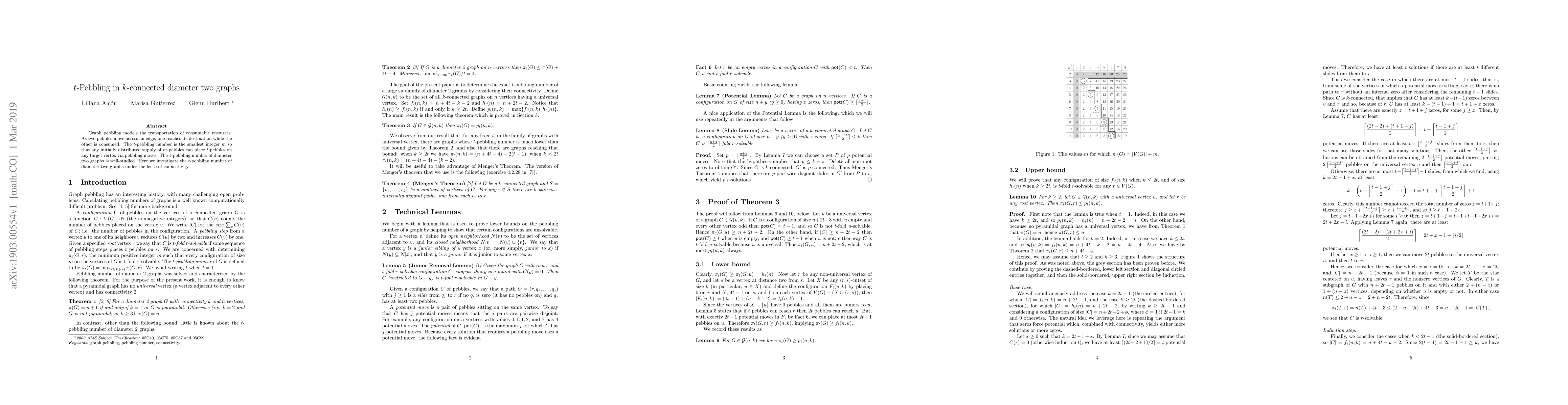 The paper investigates the $t$-pebbling number of diameter two graphs focusing on their connectivity, defining $G(n,k)$ as the set of $k$-connected graphs on $n$ vertices with a universal vertex, and using Menger's Theorem to prove results.