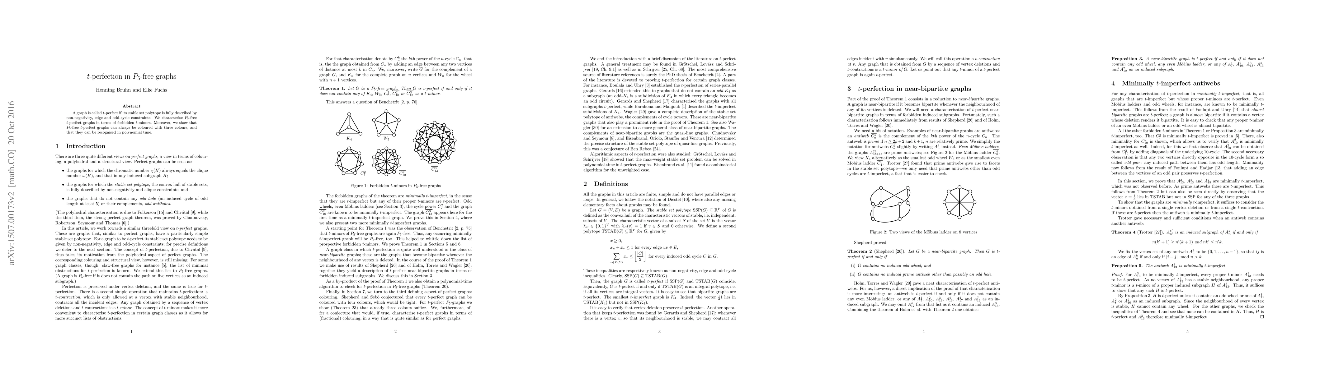 The paper characterizes $P_5$-free $t$-perfect graphs in terms of forbidden $t$-minors and demonstrates their polynomial-time recognizability.