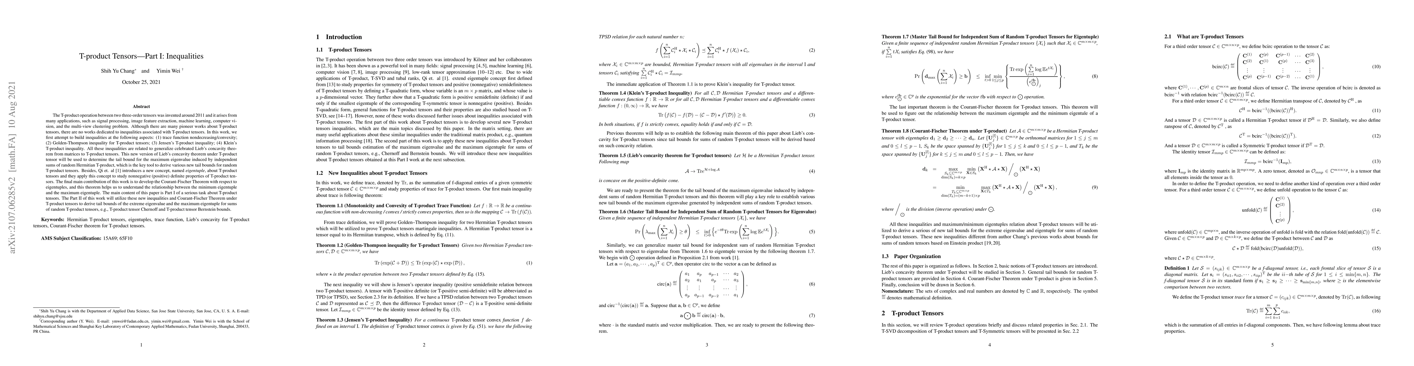 The T product operation between two three order tensors was invented around 2011 and it arises from many applications, such as signal processing, image feature extraction, machine learning, computer vision, and the multiview clustering problem. Although there are many pioneer works about T product tensors, there are no works dedicated to inequalities associated with T product tensors. In this work, we first attempt to build inequalities at the following aspects: (1) trace function nondecreasing and convexity; (2) Golden Thompson inequality for T product tensors; (3) Jensen T product inequality; (4) Klein T product inequality. All these inequalities are related to generalize celebrated Lieb concavity theorem from matrices to T product tensors. This new version of Lieb concavity theorem under T product tensor will be used to determine the tail bound for the maximum eigenvalue induced by independent sums of random Hermitian T product, which is the key tool to derive various new tail bounds for random T product tensors. Besides, Qi et. al introduces a new concept, named eigentuple, about T product tensors and they apply this concept to study nonnegative (positive) definite properties of T product tensors. The final main contribution of this work is to develop the Courant Fischer Theorem with respect to eigentuples, and this theorem helps us to understand the relationship between the minimum eigentuple and the maximum eigentuple. The main content of this paper is Part I of a serious task about T product tensors. The Part II of this work will utilize these new inequalities and Courant Fischer Theorem under T product tensors to derive tail bounds of the extreme eigenvalue and the maximum eigentuple for sums of random T product tensors, e.g., T product tensor Chernoff and T product tensor Bernstein bounds.
