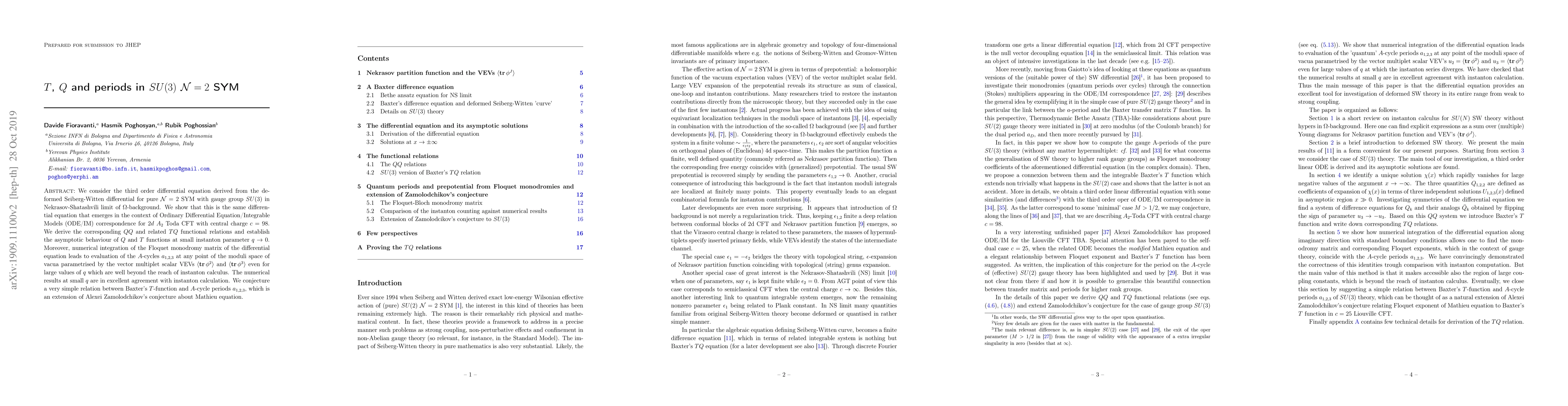 This paper explores a third-order differential equation from the deformed Seiberg-Witten theory for $SU(3)$ ${\cal N}=2$ SYM in the Nekrasov-Shatashvili limit, showing its equivalence to the $2d$ $A_2$ Toda CFT. It derives $QQ$ and $TQ$ functional relations and evaluates $A$-cycles numerically, revealing a simple relation between Baxter's $T$-function and $A$-cycle periods.