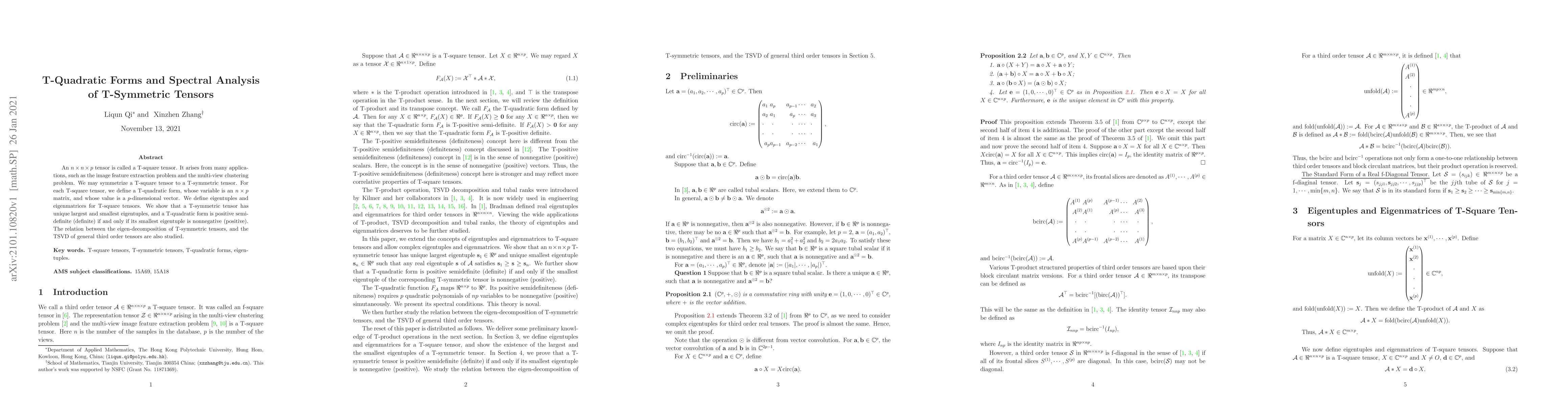 This paper explores T-quadratic forms derived from T-symmetric tensors, which are significant in applications like image feature extraction and multi-view clustering. It establishes conditions for positive semi-definiteness and defines eigentuples and eigenmatrices, proving unique largest and smallest eigentuples for T-symmetric tensors.