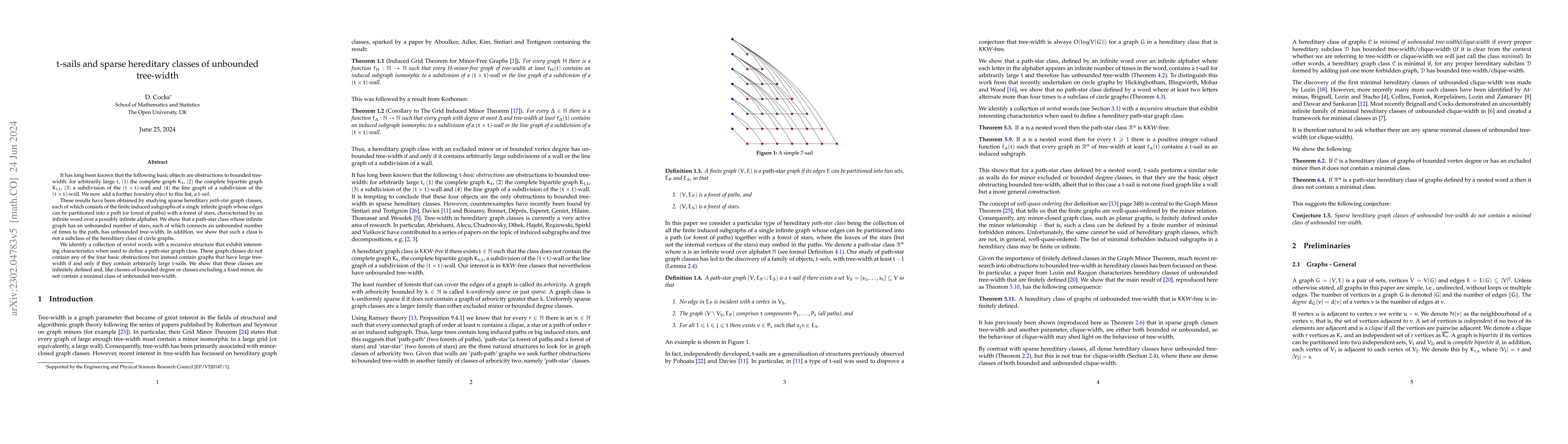 This paper introduces $t$-sails as new boundary objects obstructing bounded tree-width, extending beyond traditional obstructions like complete graphs and wall subdivisions. It explores sparse hereditary path-star graph classes, demonstrating that those with an unbounded number of stars connecting frequently to the path have unbounded tree-width and do not fit into the hereditary class of circle graphs.