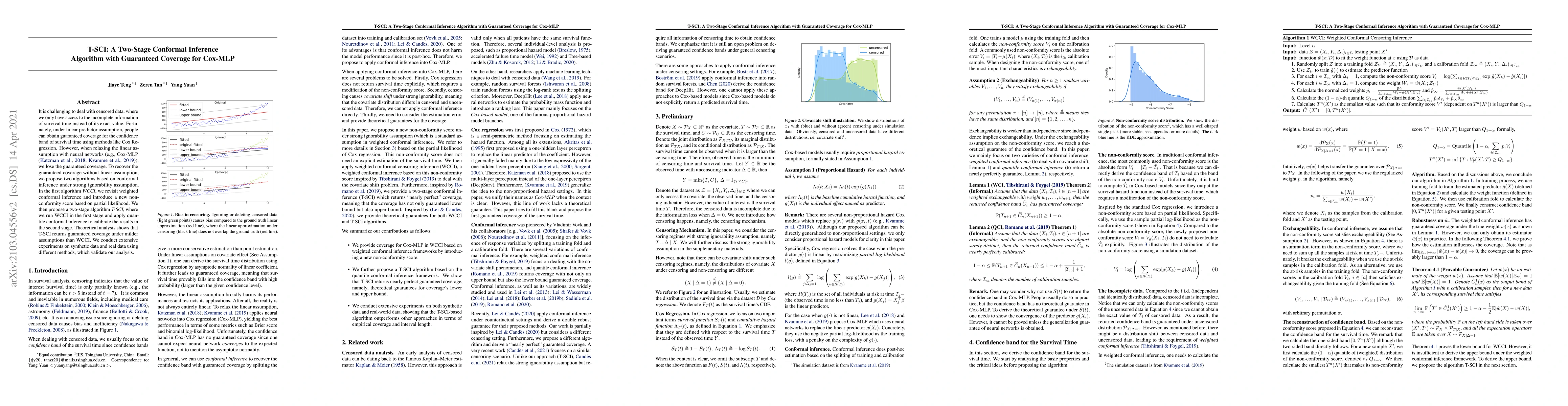 The paper proposes T-SCI, a two-stage conformal inference algorithm to achieve guaranteed coverage for Cox-MLP models, addressing the challenge of censored survival data. The method combines weighted conformal inference with quantile conformal inference to maintain coverage under non-linear assumptions.
