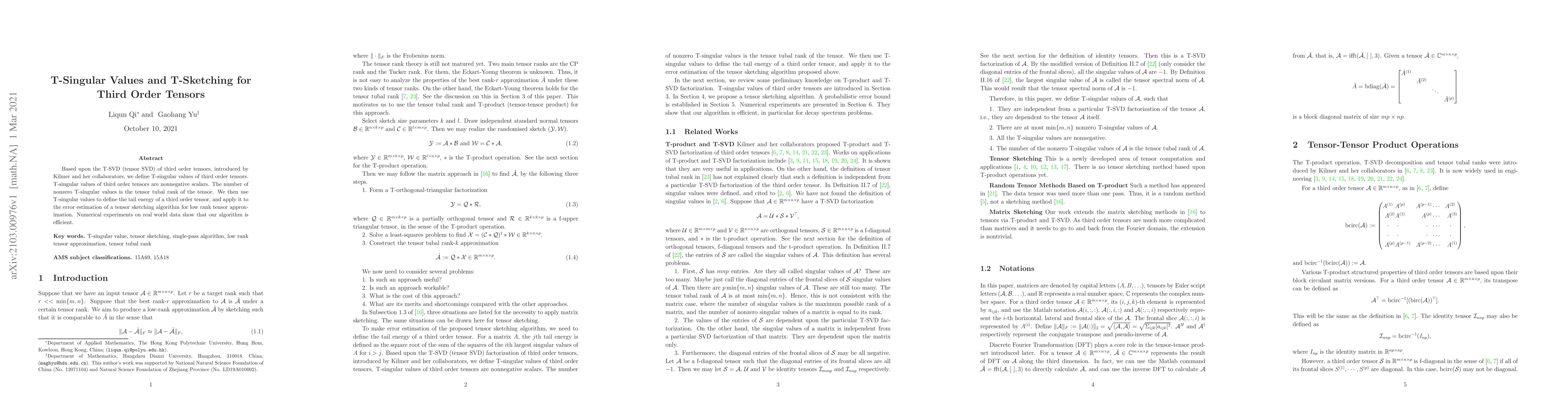 This paper introduces T-singular values for third order tensors based on tensor SVD, defining the tensor tubal rank and using tail energy for error estimation in tensor sketching algorithms. The proposed tensor sketching method is shown to be efficient through numerical experiments on real-world data.