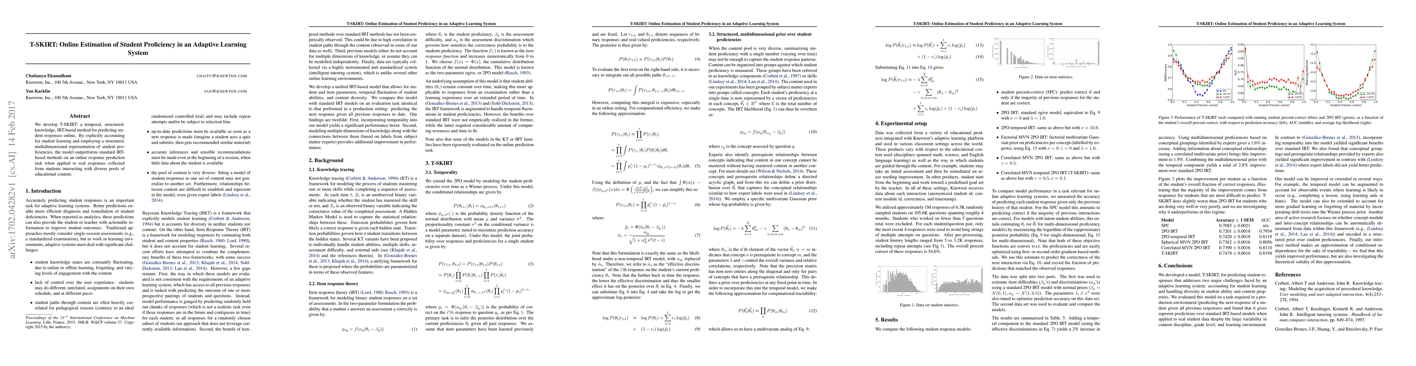Summary: T-SKIRT is an advanced method for online prediction of student responses in adaptive learning systems, outperforming standard IRT-based approaches by considering student learning and employing a structured, multidimensional representation of proficiencies. It was tested on real student interactions with educational content.
