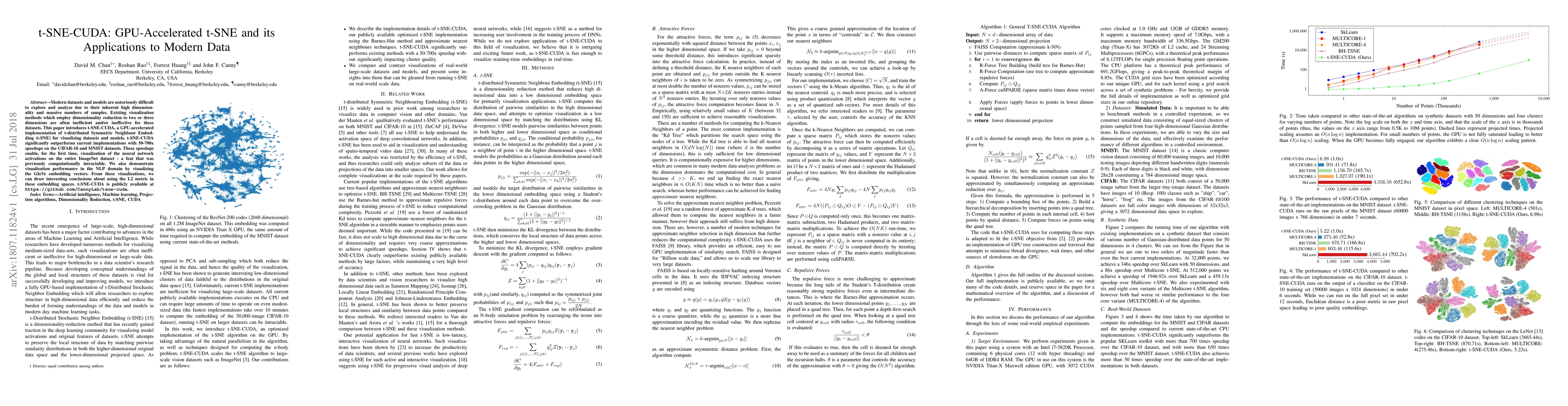 t-SNE-CUDA accelerates t-distributed Symmetric Neighbor Embedding (t-SNE) on GPUs, achieving 50-700x speedups over existing methods, enabling visualization of large datasets like ImageNet and NLP embeddings. The tool is publicly available for further exploration and analysis.