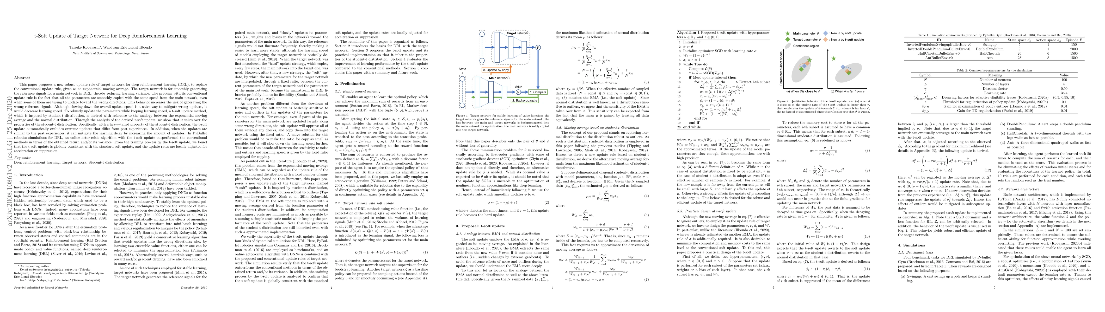 This paper proposes a t-soft update rule for the target network in deep reinforcement learning, which improves upon the conventional exponential moving average by excluding extreme updates and adjusting update rates based on past experiences, thus reducing learning variance and improving performance in simulations. The t-soft update leverages the heavy-tailed property of the student-t distribution to enhance robustness and learning speed.