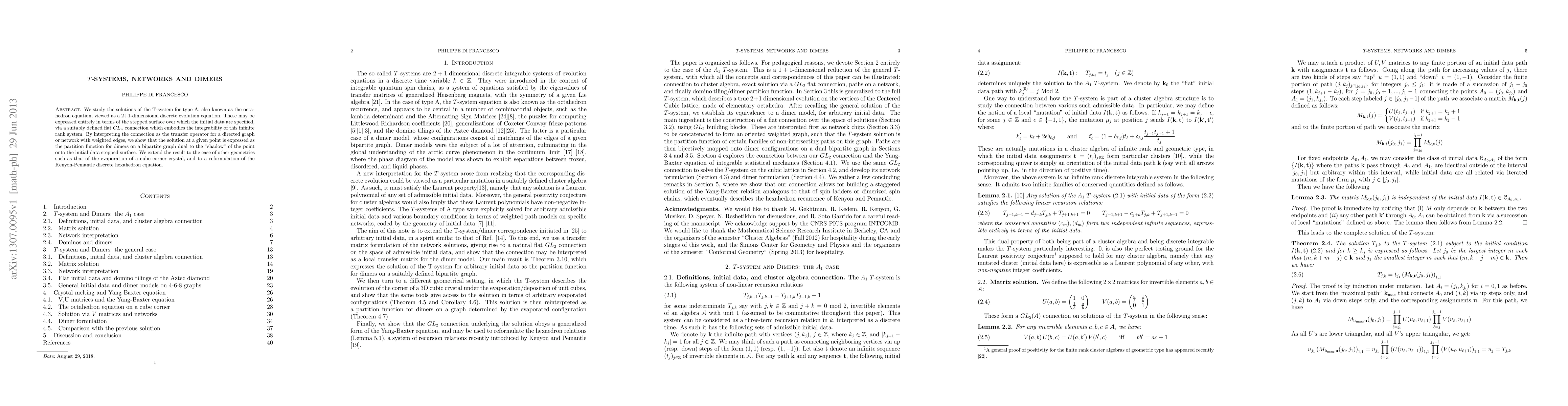 We study the solutions of the T-system for type A, also known as the octahedron equation, viewed as a 2+1-dimensional discrete evolution equation. These may be expressed entirely in terms of the stepped surface over which the initial data are specified, via a suitably defined flat $GL_n$ connection which embodies the integrability of this infinite rank system. By interpreting the connection as the transfer operator for a directed graph or network with weighted edges, we show that the solution at a given point is expressed as the partition function for dimers on a bipartite graph dual to the "shadow" of the point onto the initial data stepped surface. We extend the result to the case of other geometries such as that of the evaporation of a cube corner crystal, and to a reformulation of the Kenyon-Pemantle discrete hexahedron equation.