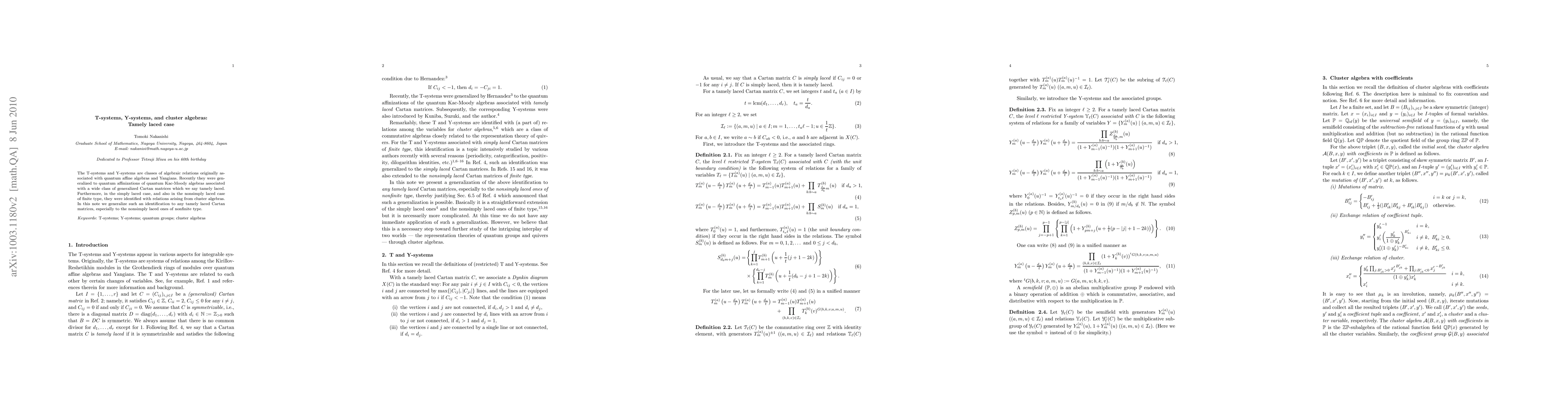 This paper generalizes the identification of T-systems and Y-systems with cluster algebras to the tamely laced case of quantum affine algebras, extending the results to nonsimply laced and nonfinite type matrices. The focus is on the algebraic relations associated with these systems.