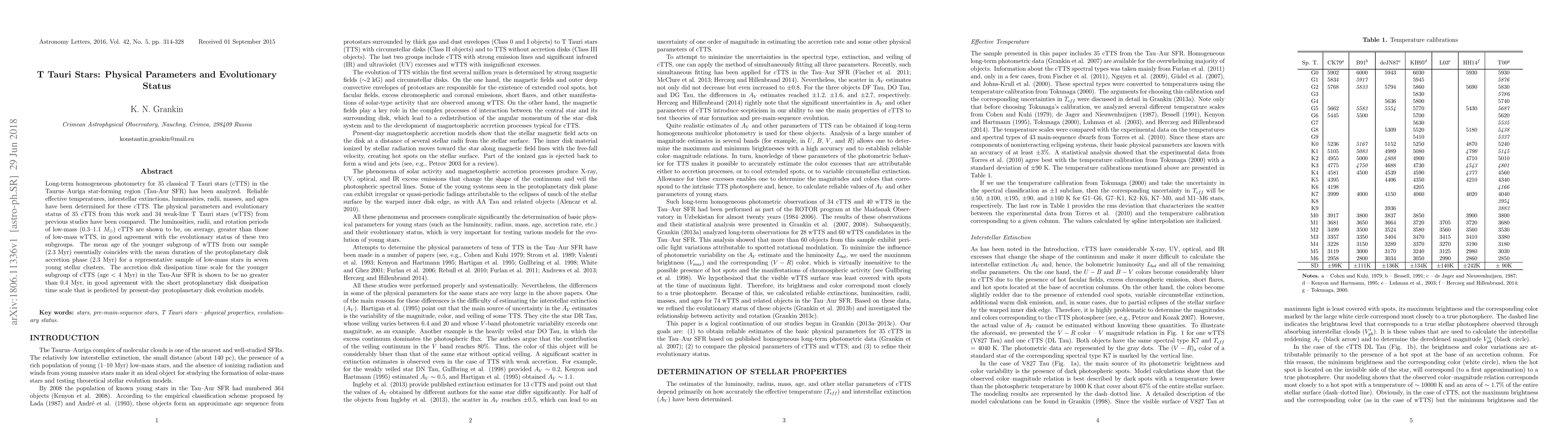 This study analyzes long-term photometry of 35 classical T Tauri stars (cTTS) in the Taurus-Auriga region, determining their physical parameters and evolutionary status. The results indicate that cTTS have, on average, greater luminosities, radii, and rotation periods than weak-line T Tauri stars (wTTS). The mean age of the younger wTTS subgroup aligns with the typical protoplanetary disk accretion phase duration. The dissipation time scale for accretion disks of younger cTTS is estimated to be no more than 0.4 Myr, consistent with current disk evolution models.