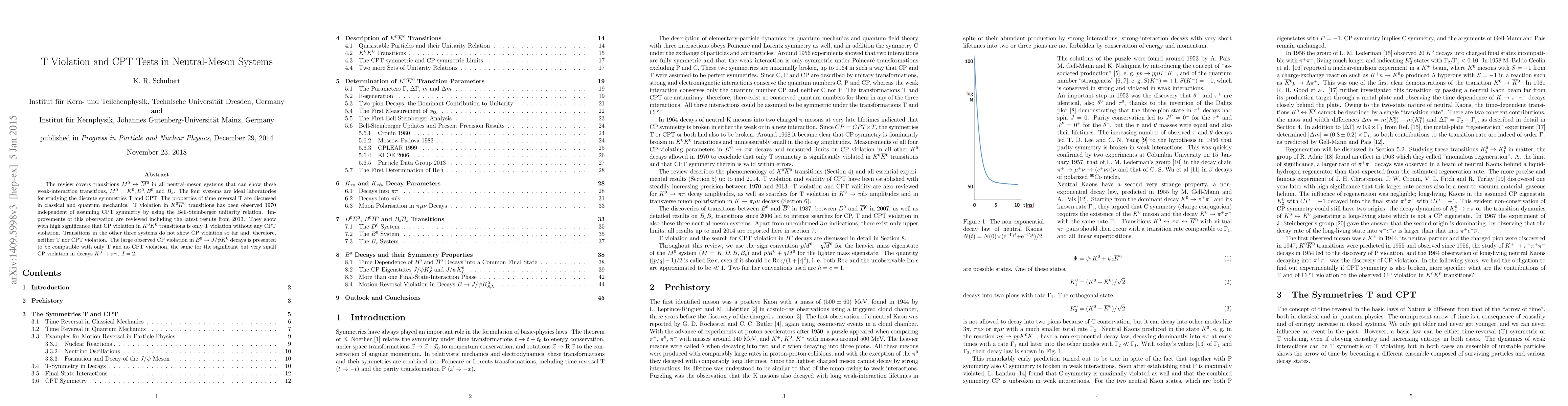 The review covers transitions between M0 and M0bar in all four systems M0 = K0, D0, B0 and Bs. These systems are ideal laboratories for studying the discrete symmetries T and CPT. The properties of time reversal T are discussed in classical and quantum mechanics. T violation in K0 K0bar transitions has been observed in 1970 independent of assuming CPT symmetry by using the Bell-steinberger unitarity relation. Improvements of this observation are reviewed including the latest results in 2013. They show with high significance that CP violation in K0 K0bar transitions is only T violation without any CPT violation. Transitions in the other three systems do not show CP violation so far and therefore neither T nor CPT violation. The large observed CP violation in B0 -> J/psi K0 decays is presented to be compatible with only T and no CPT violation, the same for the very small but significant CP violation in decays K0 -> pi pi with isospin 2.