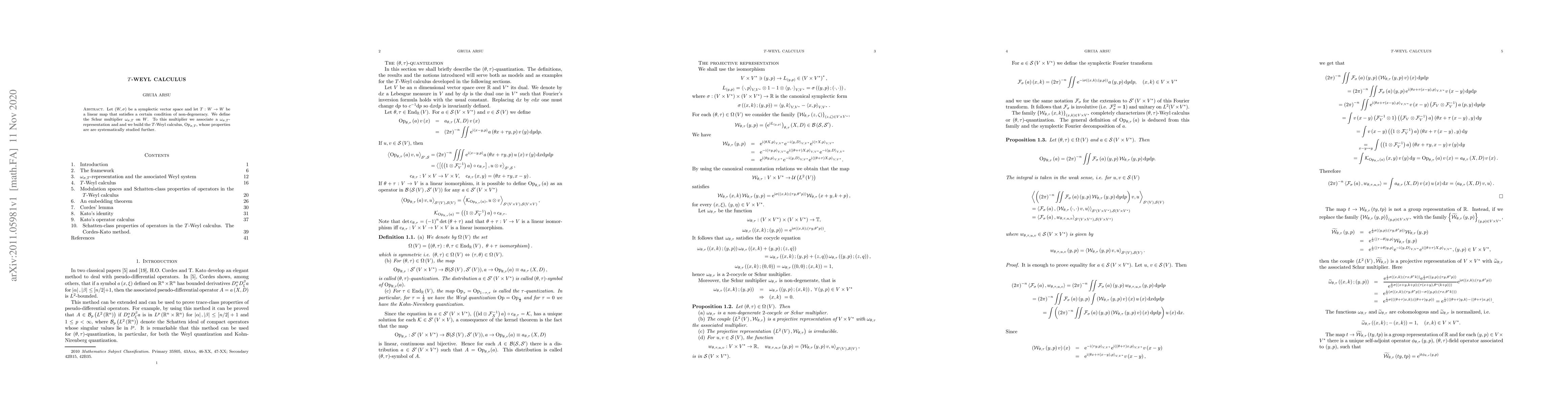 Let $\left( W,\sigma \right) $ be a symplectic vector space and let $% T:W\rightarrow W$ be a linear map that satisfies a certain condition of non-degeneracy. We define the Schur multiplier $\omega _{\sigma ,T}$ on $W$. To this multiplier we associate a $\omega _{\sigma ,T}$-representation and and we build the $T$-Weyl calculus, $\mathrm{Op}_{\sigma ,T}$, whose properties are are systematically studied further.