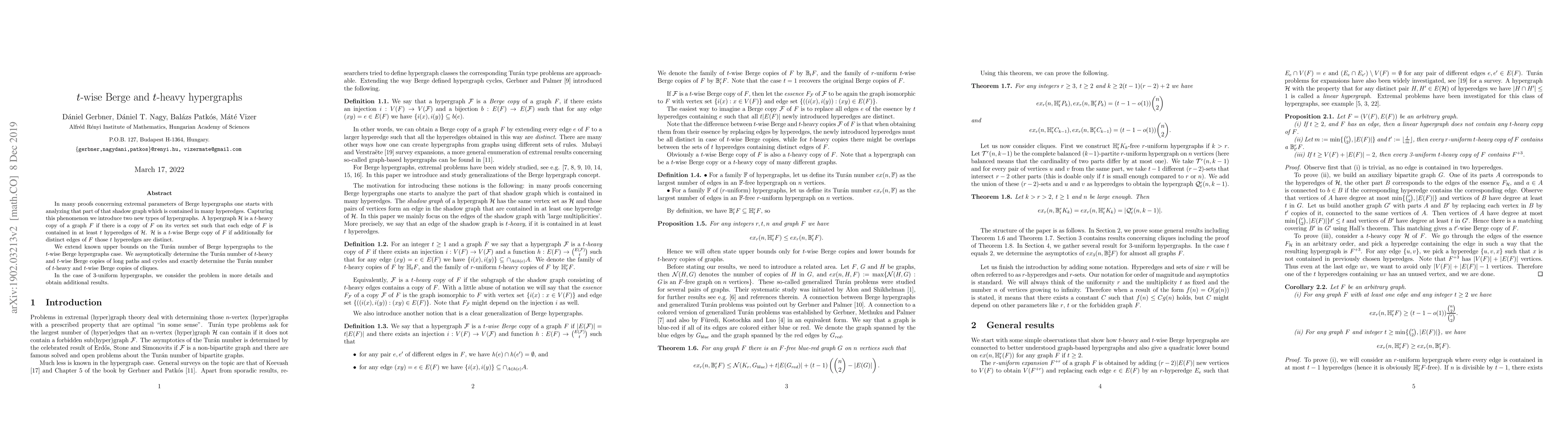 In many proofs concerning extremal parameters of Berge hypergraphs one starts with analyzing that part of that shadow graph which is contained in many hyperedges. Capturing this phenomenon we introduce two new types of hypergraphs. A hypergraph $\mathcal{H}$ is a $t$-heavy copy of a graph $F$ if there is a copy of $F$ on its vertex set such that each edge of $F$ is contained in at least $t$ hyperedges of $\mathcal{H}$. $\mathcal{H}$ is a $t$-wise Berge copy of $F$ if additionally for distinct edges of $F$ those $t$ hyperedges are distinct. We extend known upper bounds on the Tur\'an number of Berge hypergraphs to the $t$-wise Berge hypergraphs case. We asymptotically determine the Tur\'an number of $t$-heavy and $t$-wise Berge copies of long paths and cycles and exactly determine the Tur\'an number of $t$-heavy and $t$-wise Berge copies of cliques. In the case of 3-uniform hypergraphs, we consider the problem in more details and obtain additional results.