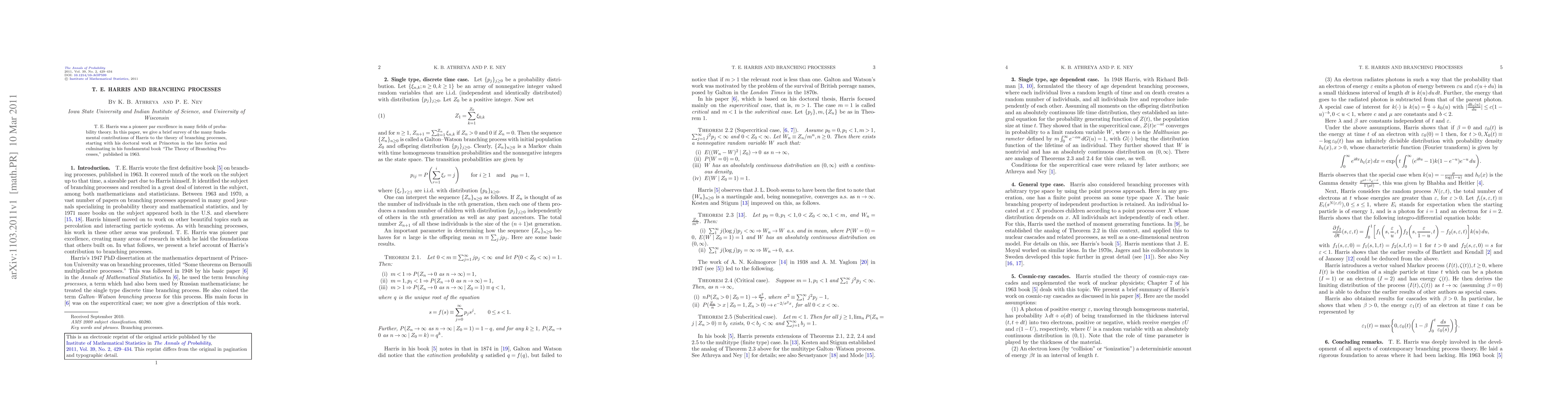 This paper surveys T. E. Harris's seminal contributions to the theory of branching processes, highlighting his foundational work from his doctoral research at Princeton in the late 1940s to the publication of his influential book "The Theory of Branching Processes" in 1963.