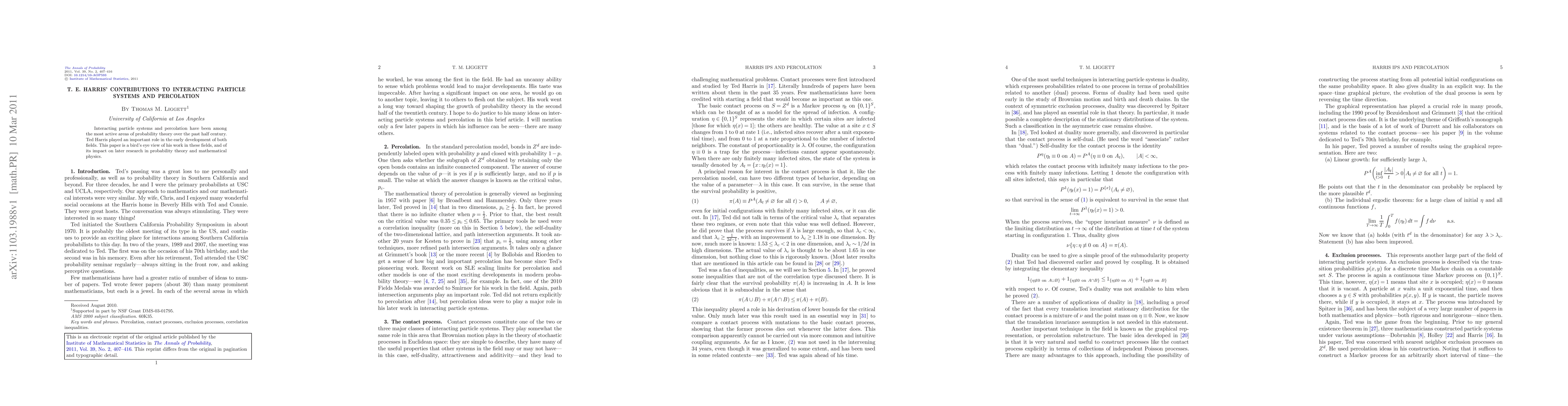 Summary: This paper provides an overview of T. E. Harris' influential contributions to the fields of interacting particle systems and percolation, highlighting his foundational role in shaping subsequent research in probability theory and mathematical physics.