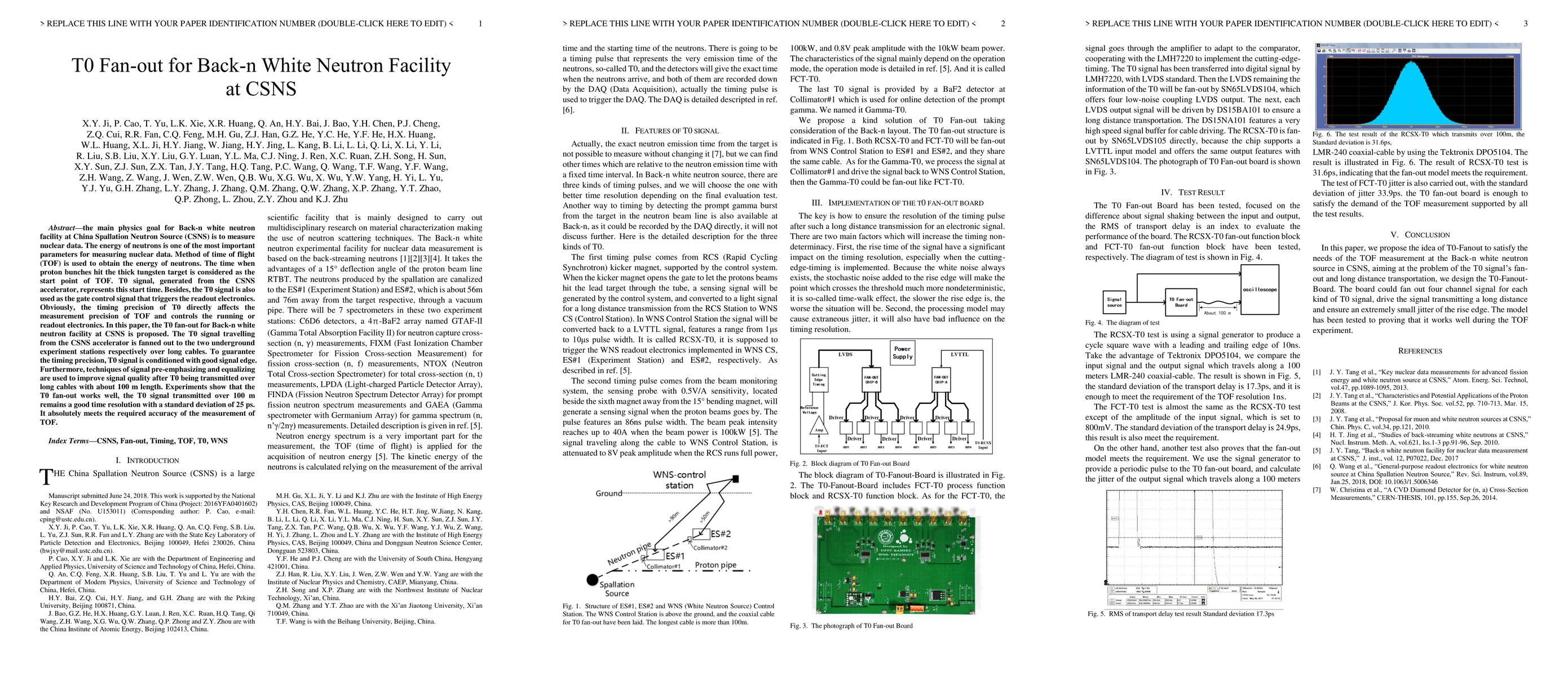This paper proposes a T0 fan-out system for the Back-n white neutron facility at CSNS, ensuring precise timing for nuclear data measurement via the time-of-flight method. Techniques like signal pre-emphasis and equalization maintain signal quality over 100 m cables, achieving a time resolution standard deviation of 25 ps, meeting measurement accuracy requirements.