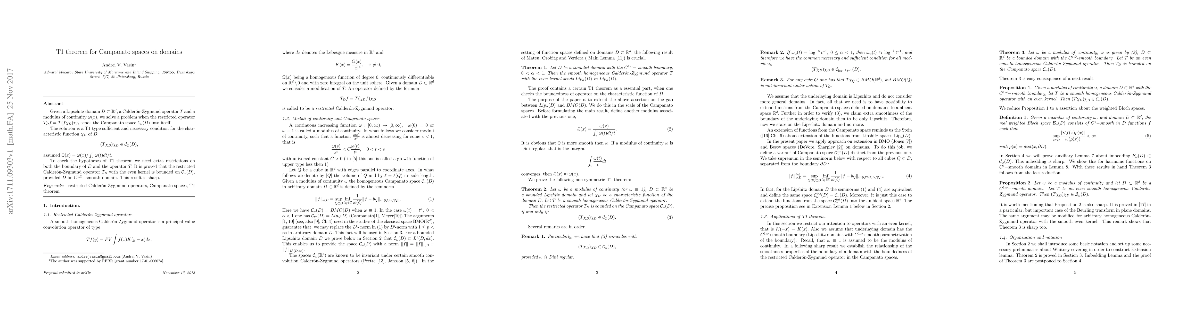 Given a Lipschitz domain $D\subset \mathbb{R}^d,$ a Calder\'on-Zygmund operator $T$ and a modulus of continuity $\omega(x),$ we solve a problem when the restricted operator $T_Df=T(f\chi_D)\chi_D$ sends the Campanato space $\mathcal{C}_\omega(D)$ into itself. The solution is a T1 type sufficient and necessary condition for the characteristic function $\chi_D$ of $D$: $$(T\chi_D)\chi_D \in \mathcal{C}_{\tilde{\omega}}(D),$$ assumed $\tilde{\omega}(x)= \omega(x)/\int_x^1 \omega(t)dt/t.$ To check the hypotheses of T1 theorem we need extra restrictions on both the boundary of $D$ and the operator $T.$ It is proved that the restricted Calder\'on-Zygmund operator $T_D$ with the even kernel is bounded on $\mathcal{C}_\omega(D),$ provided $D$ be $C^{1,\tilde{\omega}}-$smooth domain. This result is sharp.