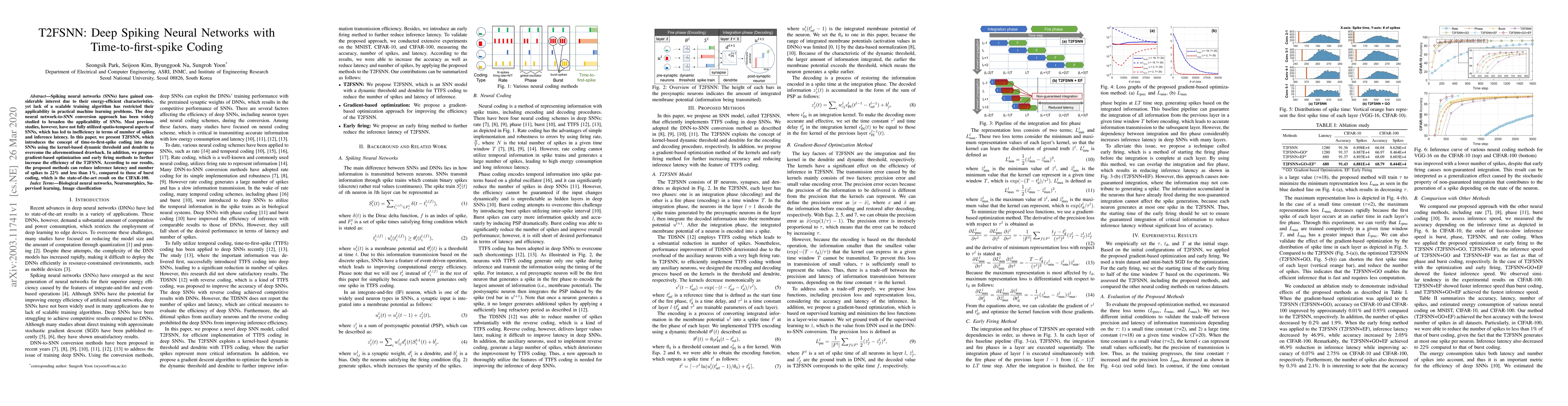 This paper introduces T2FSNN, a deep spiking neural network utilizing time-to-first-spike coding to enhance efficiency. The proposed method reduces inference latency and spike count by 22% and less than 1%, respectively, compared to burst coding, through gradient-based optimization and early firing techniques.