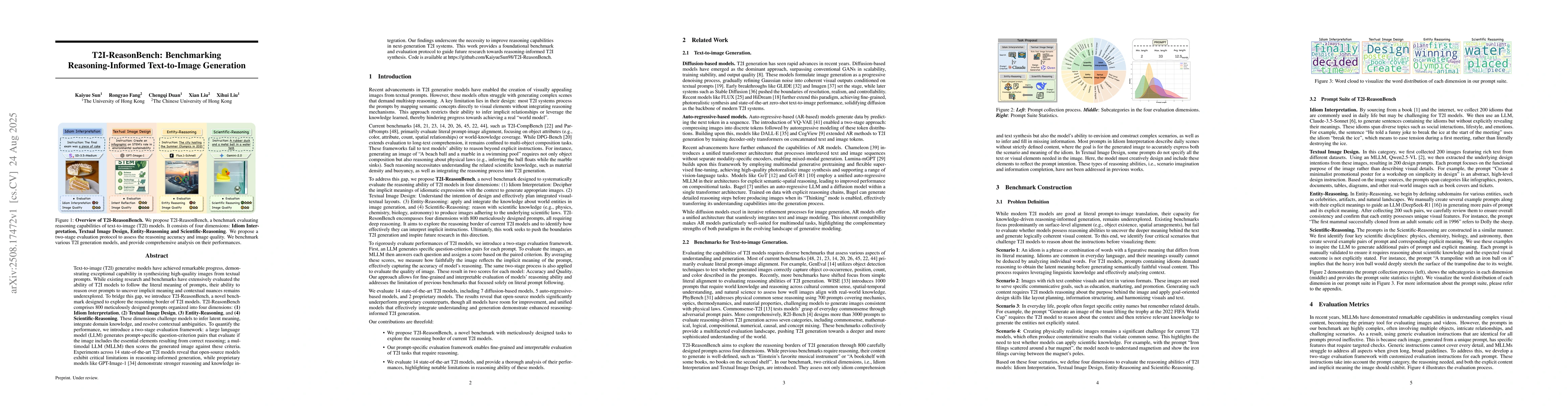 We propose T2I-ReasonBench, a benchmark evaluating reasoning capabilities of text-to-image (T2I) models. It consists of four dimensions: Idiom Interpretation, Textual Image Design, Entity-Reasoning and Scientific-Reasoning. We propose a two-stage evaluation protocol to assess the reasoning accuracy and image quality. We benchmark various T2I generation models, and provide comprehensive analysis on their performances.