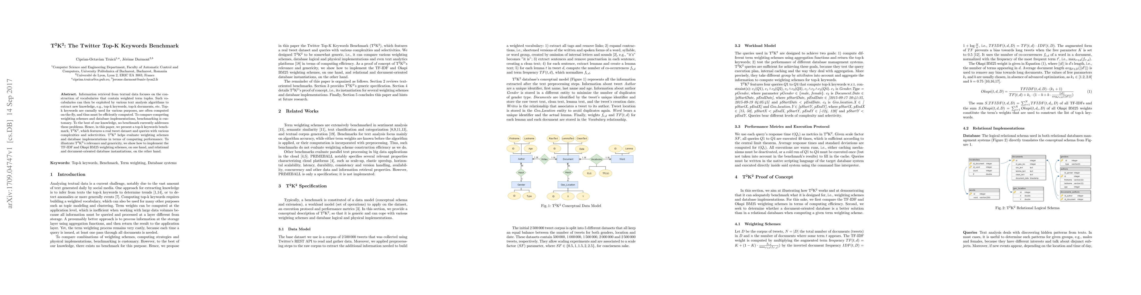 Information retrieval from textual data focuses on the construction of vocabularies that contain weighted term tuples. Such vocabularies can then be exploited by various text analysis algorithms to extract new knowledge, e.g., top-k keywords, top-k documents, etc. Top-k keywords are casually used for various purposes, are often computed on-the-fly, and thus must be efficiently computed. To compare competing weighting schemes and database implementations, benchmarking is customary. To the best of our knowledge, no benchmark currently addresses these problems. Hence, in this paper, we present a top-k keywords benchmark, T${}^2$K${}^2$, which features a real tweet dataset and queries with various complexities and selectivities. T${}^2$K${}^2$ helps evaluate weighting schemes and database implementations in terms of computing performance. To illustrate T${}^2$K${}^2$'s relevance and genericity, we successfully performed tests on the TF-IDF and Okapi BM25 weighting schemes, on one hand, and on different relational (Oracle, PostgreSQL) and document-oriented (MongoDB) database implementations, on the other hand.