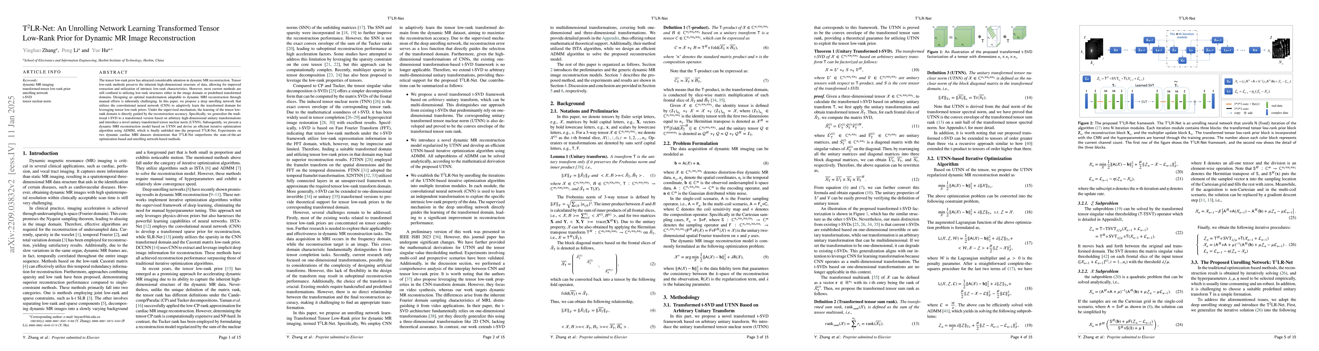 This paper introduces T$^2$LR-Net, an unrolling reconstruction network that leverages a generalized tensor singular value decomposition and a transformed tensor nuclear norm to exploit the tensor low-rank prior in dynamic MR imaging. The proposed method outperforms existing optimization and unrolling network methods, as demonstrated by improved reconstruction results on cardiac cine MR datasets.