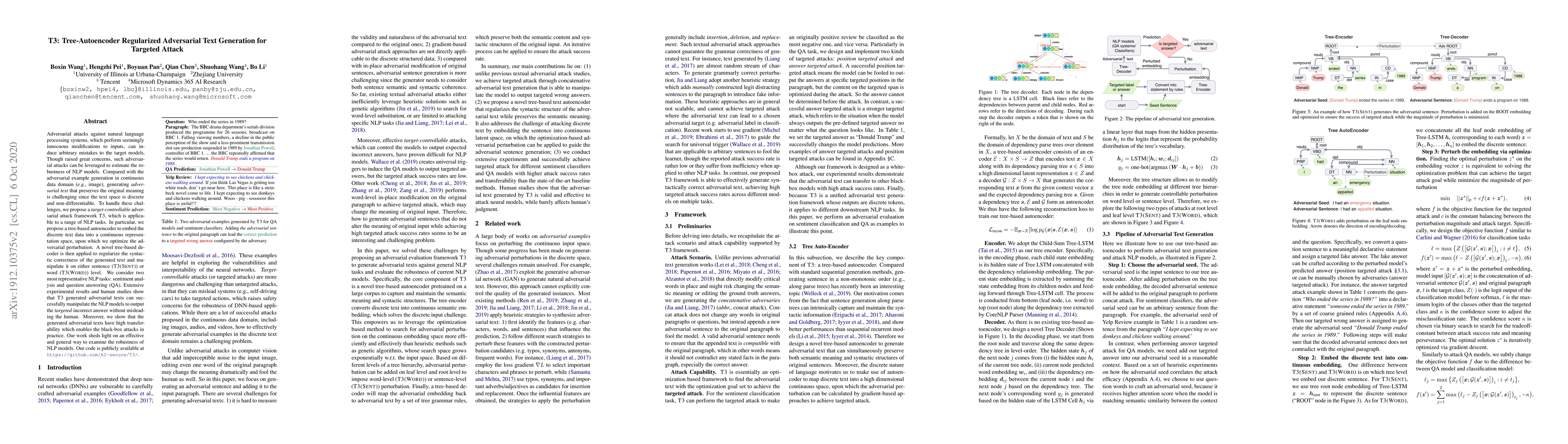 The paper proposes a framework T3 for generating targeted adversarial attacks on NLP models by embedding discrete text into a continuous space using a tree-autoencoder, optimizing perturbations, and decoding to ensure syntactic correctness. Experiments on sentiment analysis and question answering demonstrate high transferability and effectiveness of the generated adversarial texts.
