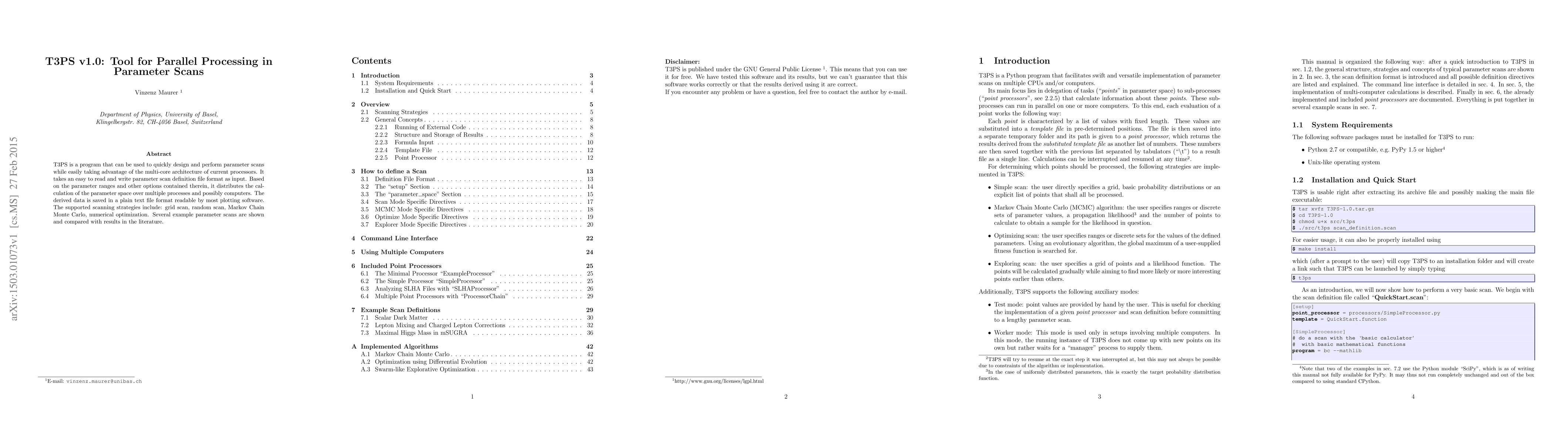 T3PS is a program that can be used to quickly design and perform parameter scans while easily taking advantage of the multi-core architecture of current processors. It takes an easy to read and write parameter scan definition file format as input. Based on the parameter ranges and other options contained therein, it distributes the calculation of the parameter space over multiple processes and possibly computers. The derived data is saved in a plain text file format readable by most plotting software. The supported scanning strategies include: grid scan, random scan, Markov Chain Monte Carlo, numerical optimization. Several example parameter scans are shown and compared with results in the literature.