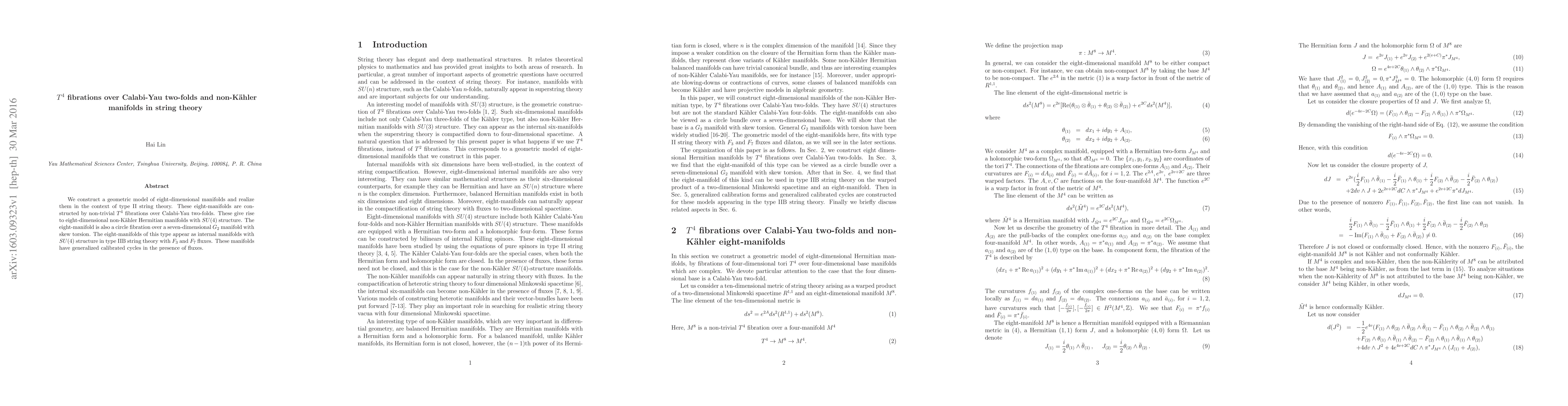 We construct a geometric model of eight-dimensional manifolds and realize them in the context of type II string theory. These eight-manifolds are constructed by non-trivial $T^{4}$ fibrations over Calabi-Yau two-folds. These give rise to eight-dimensional non-Kahler Hermitian manifolds with $SU(4)$ structure. The eight-manifold is also a circle fibration over a seven-dimensional $G_{2}$ manifold with skew torsion. The eight-manifolds of this type appear as internal manifolds with $SU(4)$ structure in type IIB string theory with $F_{3}$ and $F_{7}$ fluxes. These manifolds have generalized calibrated cycles in the presence of fluxes.
