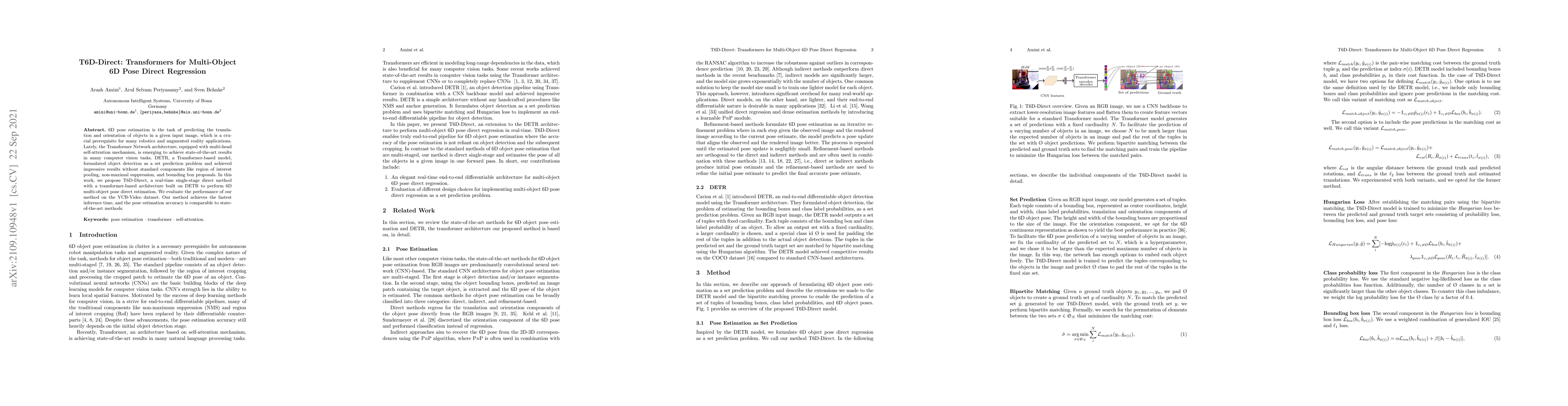 This research is significant as it introduces a transformer-based architecture for direct 6D pose estimation, which is crucial for robotics and augmented reality applications. The method is real-time capable and competitive with existing state-of-the-art methods.