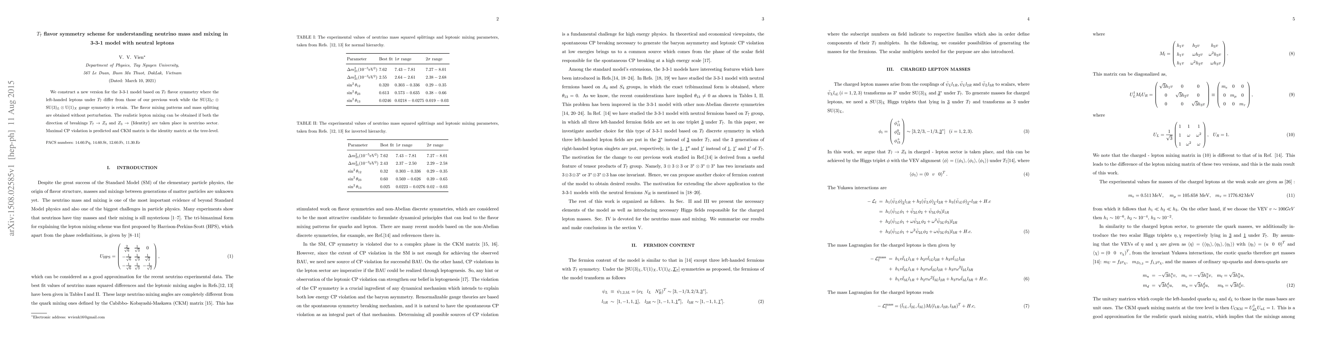 We construct a new version for the 3-3-1 model based on $T_7$ flavor symmetry where the left-handed leptons under $T_7$ differ from those of our previous work while the $\mathrm{SU}(3)_C \otimes \mathrm{SU}(3)_L \otimes \mathrm{U}(1)_X$ gauge symmetry is retain. The flavor mixing patterns and mass splitting are obtained without perturbation. The realistic lepton mixing can be obtained if both the direction of breakings $T_7 \rightarrow Z_3$ and $Z_3 \rightarrow \{\mathrm{Identity}\}$ are taken place in neutrino sector. Maximal CP violation is predicted and CKM matrix is the identity matrix at the tree-level.