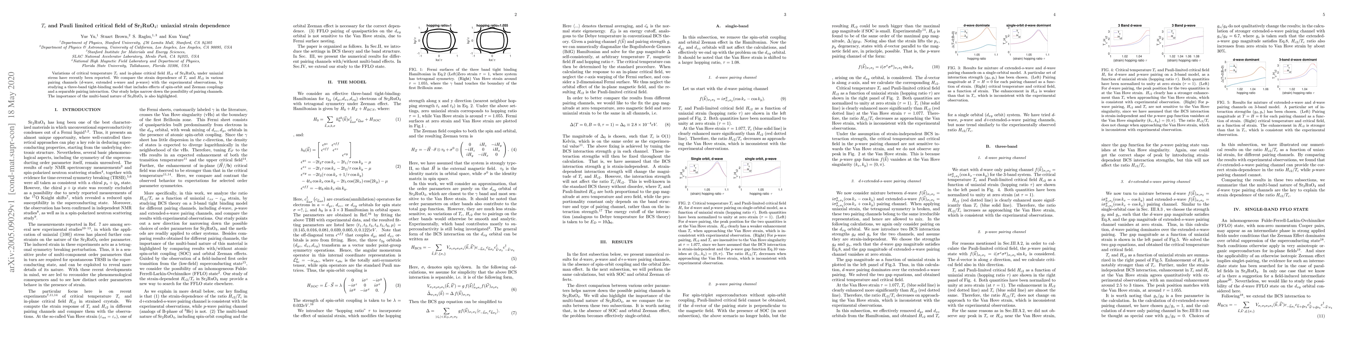 This paper investigates the effects of uniaxial strain on the critical temperature $T_c$ and in-plane critical field $H_{c2}$ of $\text{Sr}_2\text{Ru}\text{O}_4$ using a three-band tight-binding model, aiming to identify the pairing channel among $d$-wave, extended s-wave, and $p$-wave. The study highlights the significance of the multi-band nature of $\text{Sr}_2\text{Ru}\text{O}_4$ in determining these properties.