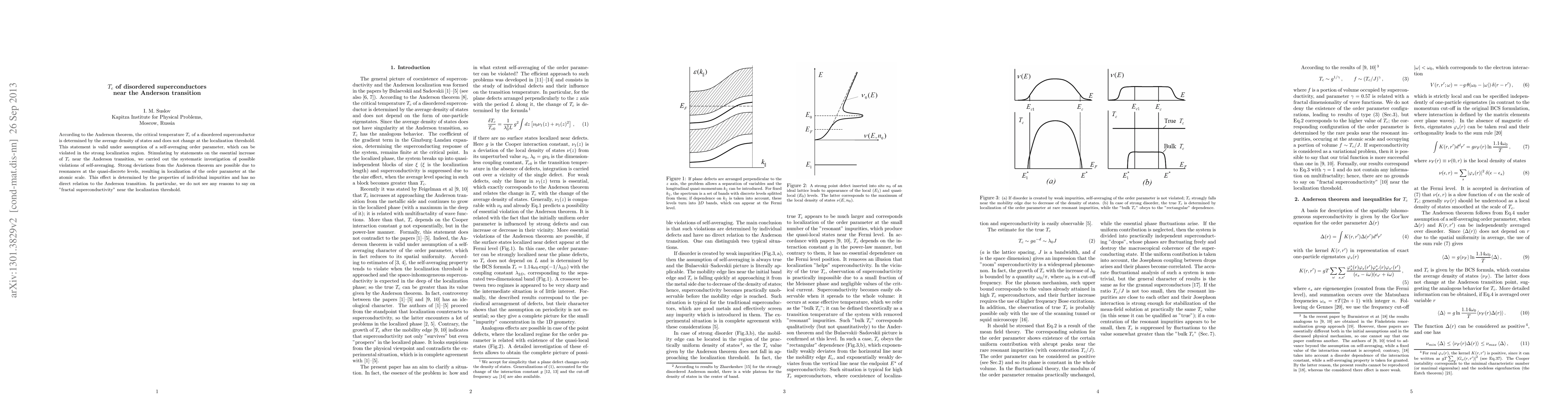 This paper investigates the critical temperature T_c of disordered superconductors near the Anderson transition, finding that strong deviations from the Anderson theorem can occur due to resonances at quasi-discrete levels, leading to atomic-scale localization of the order parameter. It concludes there is no basis for "fractal superconductivity" near the localization threshold.