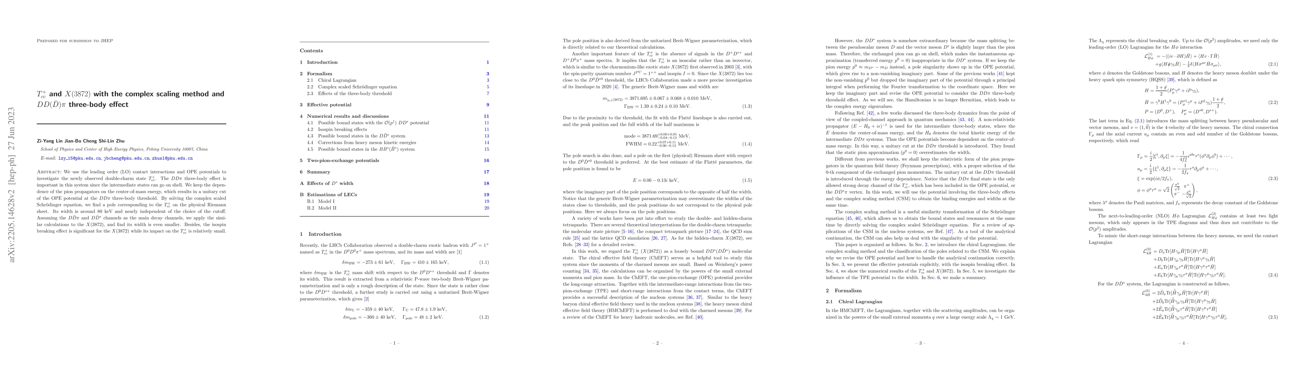 This paper investigates the double-charm state $T_{cc}^+$ and the $X(3872)$ using the complex scaling method and considers the $DD\pi$ three-body effect. The study finds a $T_{cc}^+$ width of around 80 keV and a much smaller width for $X(3872)$, with significant isospin breaking for the latter.