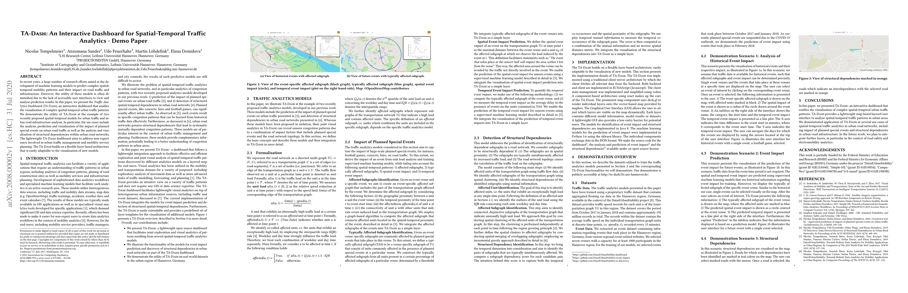 In recent years, a large number of research efforts aimed at the development of machine learning models to predict complex spatial-temporal mobility patterns and their impact on road traffic and infrastructure. However, the utility of these models is often diminished due to the lack of accessible user interfaces to view and analyse prediction results. In this paper, we present the Traffic Analytics Dashboard ( TA-Dash), an interactive dashboard that enables the visualisation of complex spatial-temporal urban traffic patterns. We demonstrate the utility of TA-Dash at the example of two recently proposed spatial-temporal models for urban traffic and urban road infrastructure analysis. In particular, the use cases include the analysis, prediction and visualisation of the impact of planned special events on urban road traffic as well as the analysis and visualisation of structural dependencies within urban road networks. The lightweight TA-Dash dashboard aims to address non-expert users involved in urban traffic management and mobility service planning. The TA-Dash builds on a flexible layer-based architecture that is easily adaptable to the visualisation of new models.