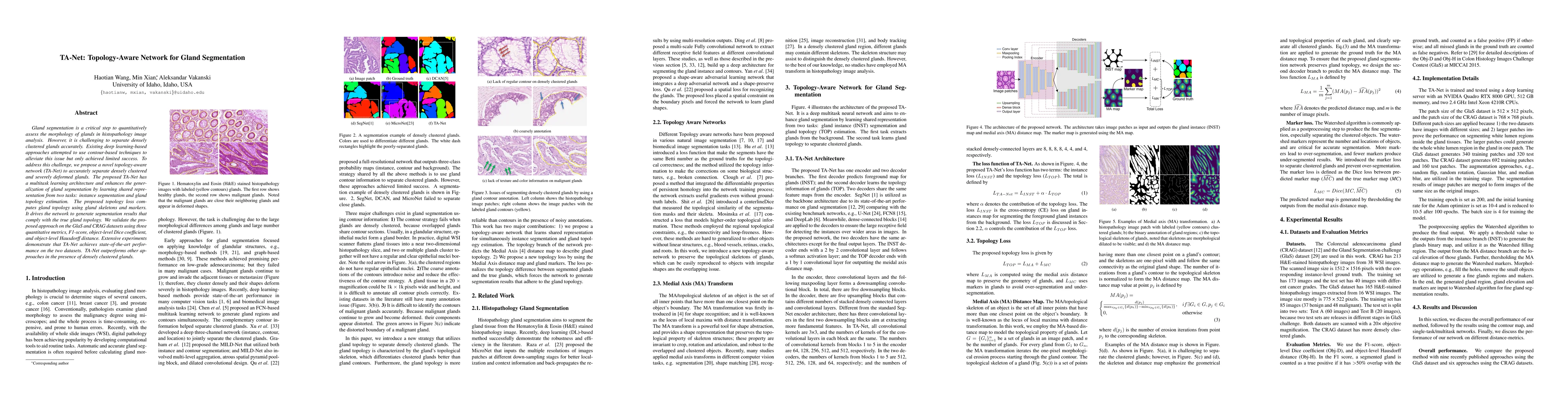 The TA-Net topology-aware network accurately segments densely clustered glands in histopathology images by leveraging multitask learning and a topology loss based on gland skeletons. It outperforms existing methods on the GlaS and CRAG datasets, achieving state-of-the-art results in gland segmentation.