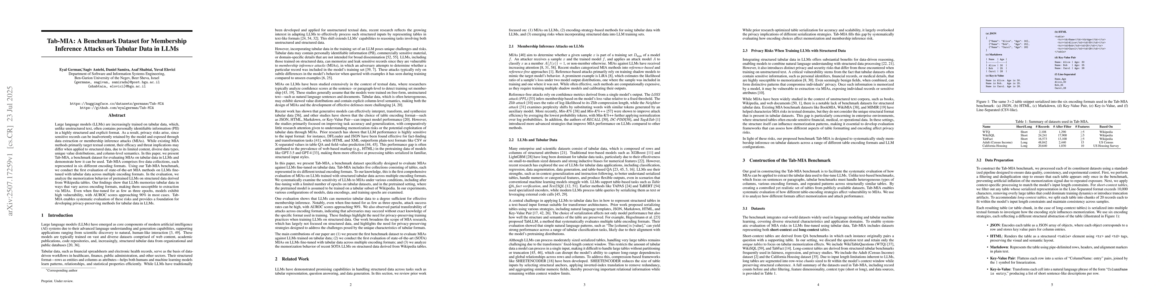 Large language models (LLMs) are increasingly trained on tabular data, which, unlike unstructured text, often contains personally identifiable information (PII) in a highly structured and explicit format. As a result, privacy risks arise, since sensitive records can be inadvertently retained by the model and exposed through data extraction or membership inference attacks (MIAs). While existing MIA methods primarily target textual content, their efficacy and threat implications may differ when applied to structured data, due to its limited content, diverse data types, unique value distributions, and column-level semantics. In this paper, we present Tab-MIA, a benchmark dataset for evaluating MIAs on tabular data in LLMs and demonstrate how it can be used. Tab-MIA comprises five data collections, each represented in six different encoding formats. Using our Tab-MIA benchmark, we conduct the first evaluation of state-of-the-art MIA methods on LLMs finetuned with tabular data across multiple encoding formats. In the evaluation, we analyze the memorization behavior of pretrained LLMs on structured data derived from Wikipedia tables. Our findings show that LLMs memorize tabular data in ways that vary across encoding formats, making them susceptible to extraction via MIAs. Even when fine-tuned for as few as three epochs, models exhibit high vulnerability, with AUROC scores approaching 90% in most cases. Tab-MIA enables systematic evaluation of these risks and provides a foundation for developing privacy-preserving methods for tabular data in LLMs.