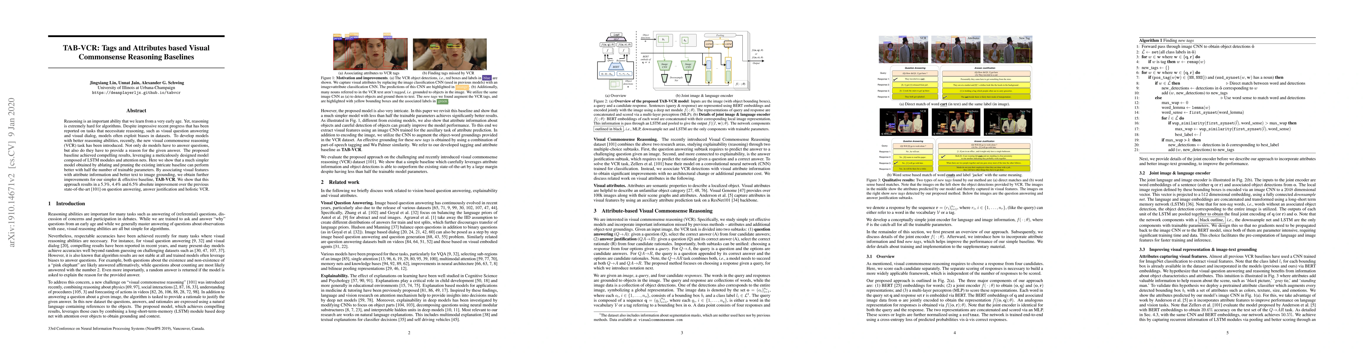 Reasoning is an important ability that we learn from a very early age. Yet, reasoning is extremely hard for algorithms. Despite impressive recent progress that has been reported on tasks that necessitate reasoning, such as visual question answering and visual dialog, models often exploit biases in datasets. To develop models with better reasoning abilities, recently, the new visual commonsense reasoning (VCR) task has been introduced. Not only do models have to answer questions, but also do they have to provide a reason for the given answer. The proposed baseline achieved compelling results, leveraging a meticulously designed model composed of LSTM modules and attention nets. Here we show that a much simpler model obtained by ablating and pruning the existing intricate baseline can perform better with half the number of trainable parameters. By associating visual features with attribute information and better text to image grounding, we obtain further improvements for our simpler & effective baseline, TAB-VCR. We show that this approach results in a 5.3%, 4.4% and 6.5% absolute improvement over the previous state-of-the-art on question answering, answer justification and holistic VCR.