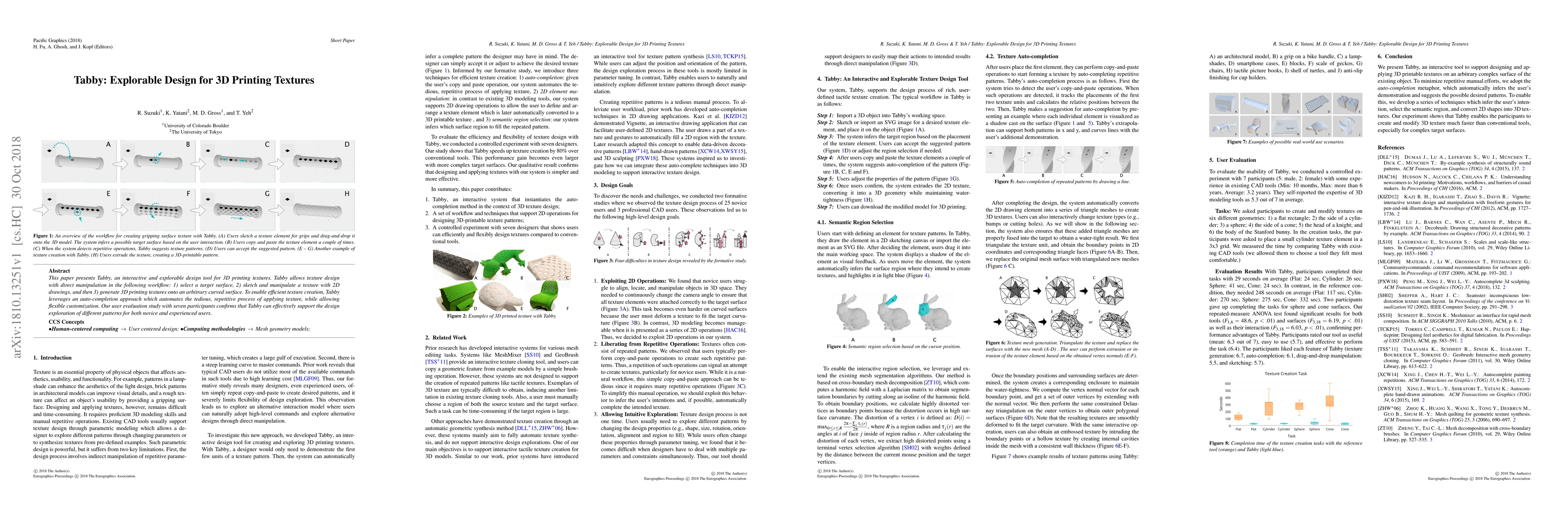 Tabby is an interactive tool for designing 3D printing textures through direct manipulation, enabling users to sketch and generate 3D textures on curved surfaces. It features an auto-completion mechanism to streamline the process and was validated by a user study showing its effectiveness for both novice and experienced users.