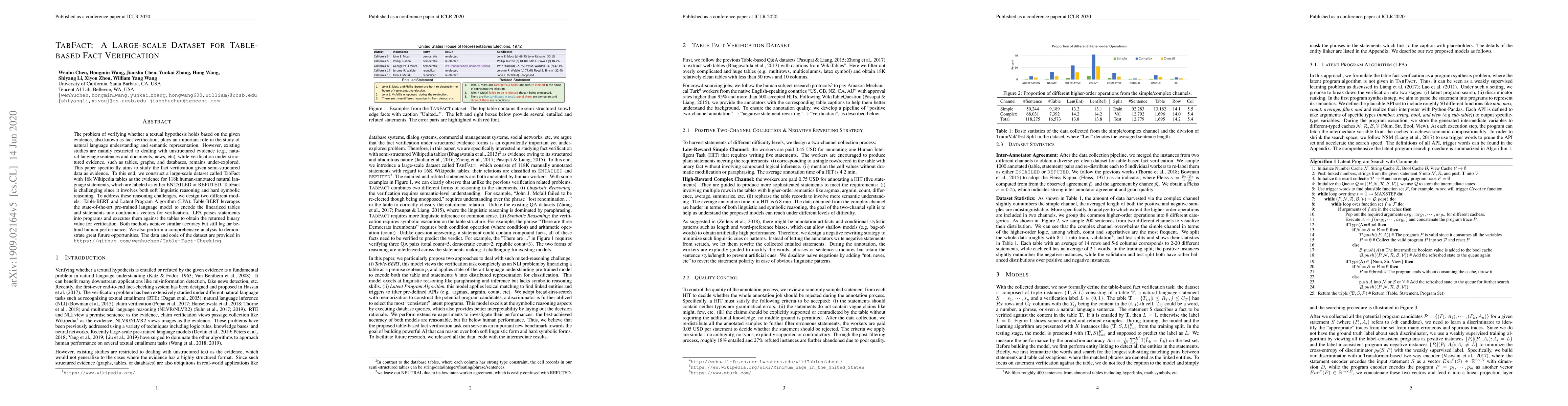 TabFact is a large-scale dataset for verifying natural language statements using Wikipedia tables as evidence, comprising 118k statements and 16k tables labeled as ENTAILED or REFUTED. The paper presents two models—Table-BERT and Latent Program Algorithm—to tackle the challenges of soft linguistic and hard symbolic reasoning in fact verification.