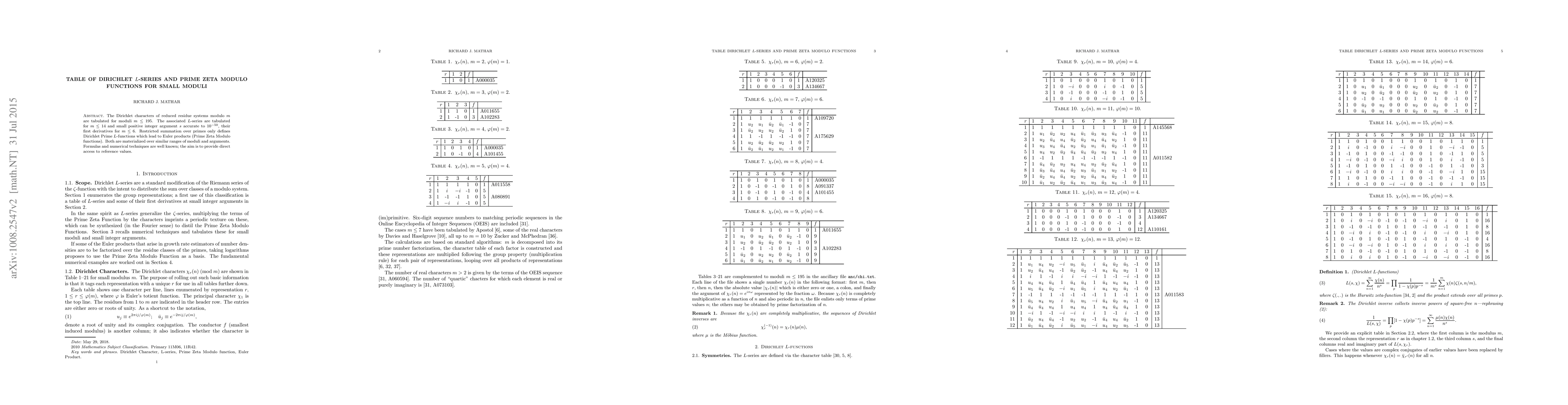 This paper tabulates Dirichlet characters and L-series for small moduli up to 195, focusing on moduli up to 14 for L-series and their derivatives up to 6. It also explores Prime Zeta Modulo functions derived from restricted prime summations, providing reference values for these mathematical constructs.