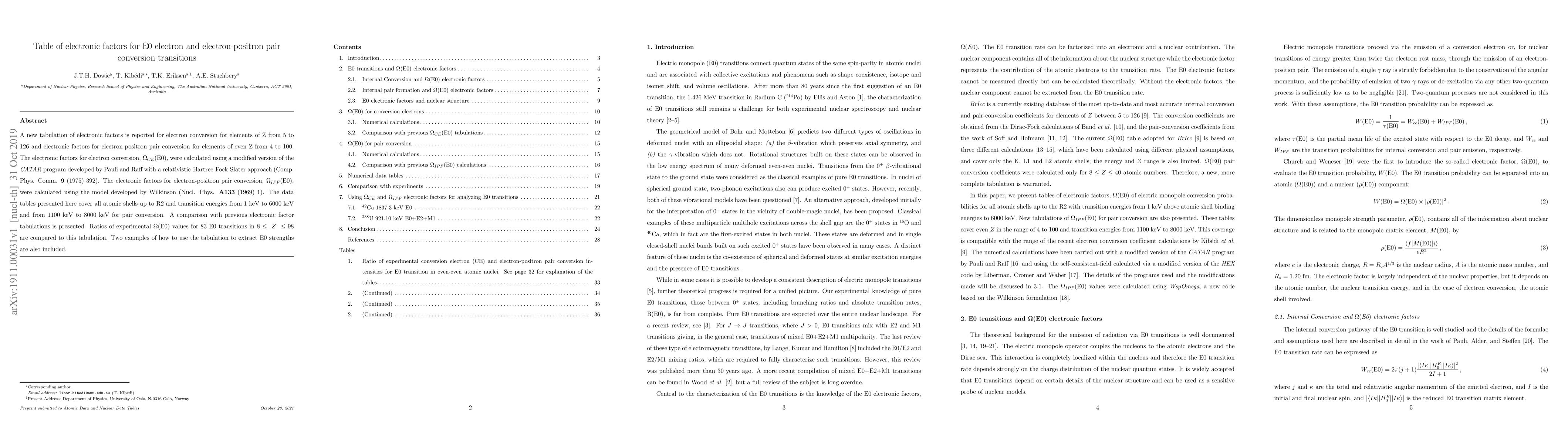 A new tabulation of electronic factors is reported for electron conversion for elements of Z from 5 to 126 and electronic factors for electron-positron pair conversion for elements of even Z from 4 to 100. The electronic factors for electron conversion, ${\Omega}_{CE}$(E0), were calculated using a modified version of the CATAR program developed by Pauli and Raff with a relativistic-Hartree-Fock-Slater approach (Pauli and Raff, 1975). The electronic factors for electron-positron pair conversion, ${\Omega}_{IPF}$(E0), were calculated using the model developed by Wilkinson (1969). The data tables presented here cover all atomic shells up to R2 and transition energies from 1 keV to 6000 keV and from 1100 keV to 8000 keV for pair conversion. A comparison with previous electronic factor tabulations is presented. Ratios of experimental {\Omega}(E0) values for 83 E0 transitions in 8$\leq$Z$\leq$98 are compared to this tabulation. Two examples of how to use the tabulation to extract E0 strengths are also included.