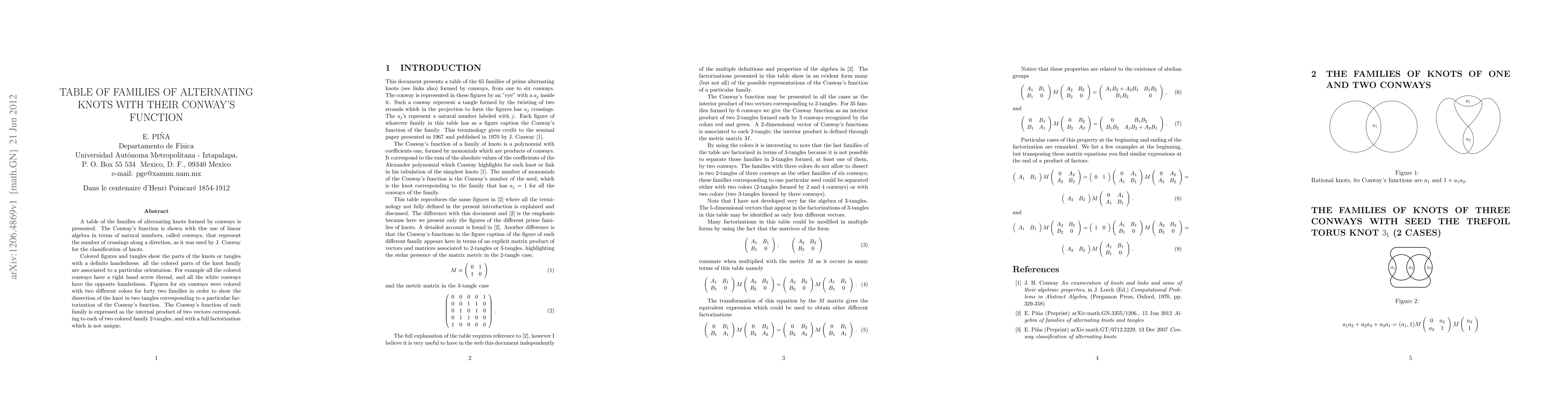A table of the families of alternating knots formed by conways is presented. The Conway's function is shown with the use of linear algebra in terms of natural numbers, called conways, that represent the number of crossings along a direction, as it was used by J. Conway for the classification of knots. Colored figures and tangles show the parts of the knots or tangles with a definite handedness: all the colored parts of the knot family are associated to a particular orientation. For example all the colored conways have a right hand screw thread, and all the white conways have the opposite handedness. Figures for six conways were colored with two different colors for forty two families in order to show the dissection of the knot in two tangles corresponding to a particular factorization of the Conway's function. The Conway's function of each family is expressed as the internal product of two vectors corresponding to each of two colored family 2-tangles, and with a full factorization which is not unique.