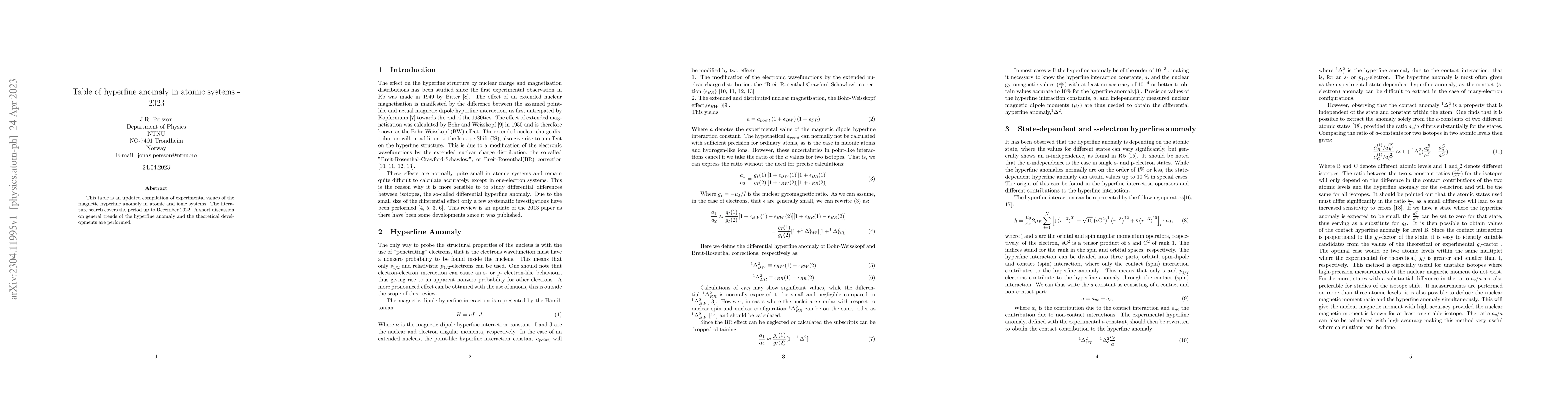 This table is an updated compilation of experimental values of the magnetic hyperfine anomaly in atomic and ionic systems. The literature search covers the period up to December 2022. A short discussion on general trends of the hyperfine anomaly and the theoretical developments are performed.