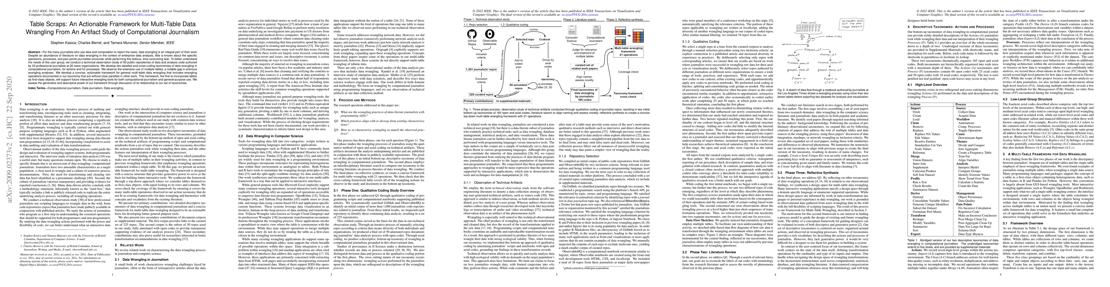 Researchers developed an actionable framework for multi-table data wrangling in computational journalism, highlighting a notable gap in previous analyses and providing tools for interactive wrangling tools.