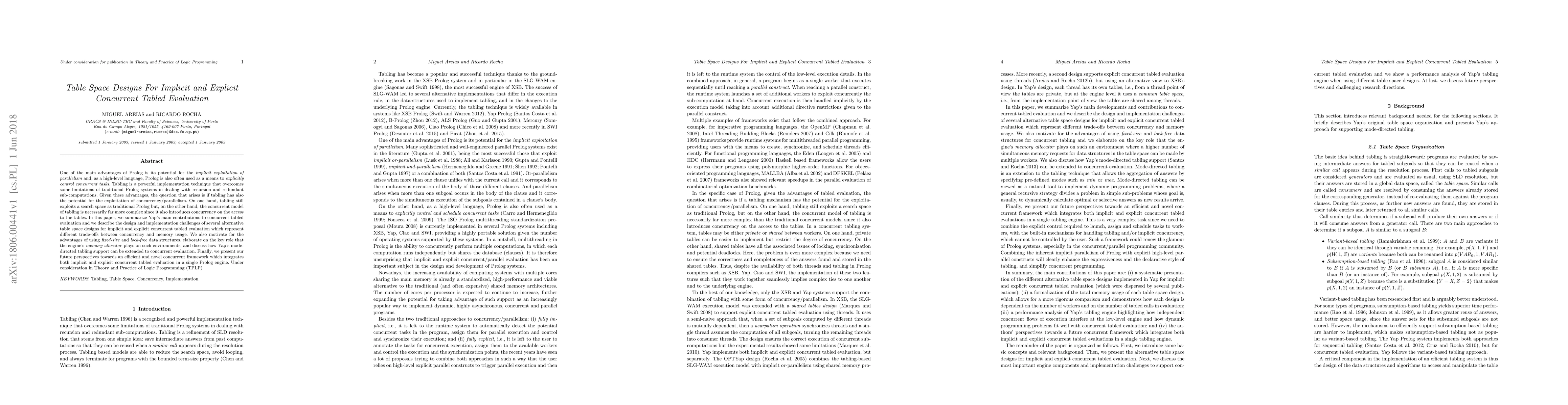This paper explores table space designs for concurrent tabled evaluation in Prolog, addressing the challenges of balancing concurrency and memory usage. It highlights Yap's contributions and discusses the trade-offs of various table space designs, emphasizing the benefits of fixed-size and lock-free data structures, and proposes a future framework integrating both implicit and explicit concurrent tabled evaluation.