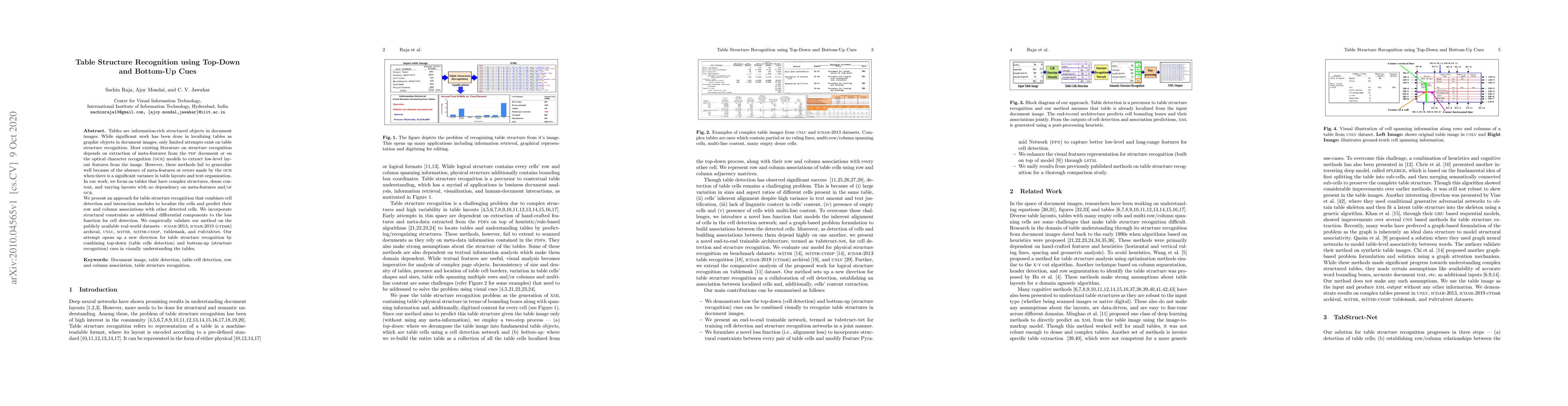 This paper proposes a novel method for recognizing table structures in document images by combining top-down and bottom-up cues, focusing on cell detection and interaction modules without relying on meta-features or OCR. The approach is validated on multiple datasets, demonstrating its effectiveness for complex, dense, and varied table layouts.