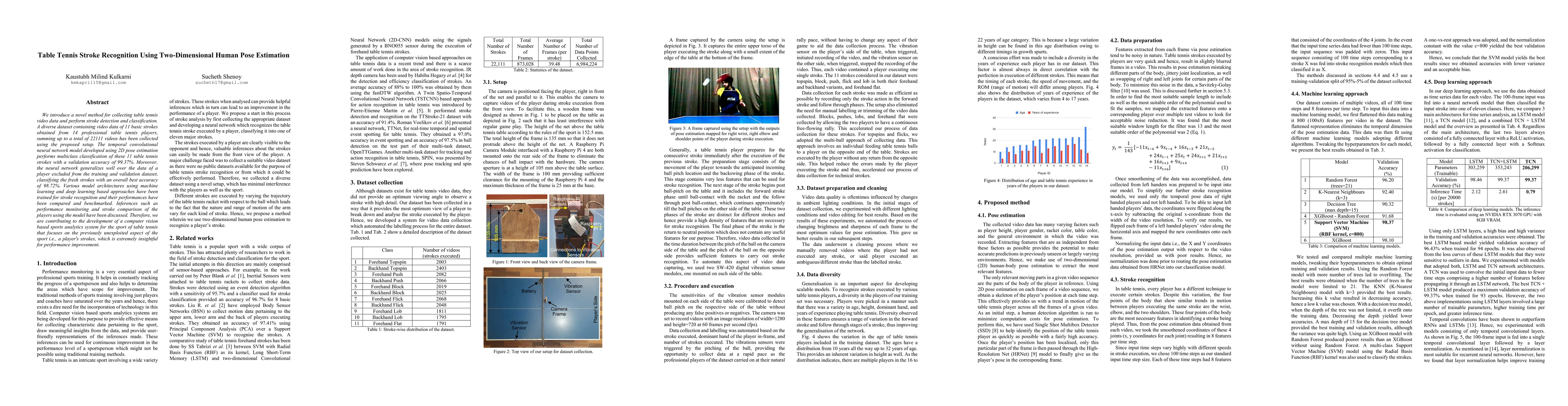 We introduce a novel method for collecting table tennis video data and perform stroke detection and classification. A diverse dataset containing video data of 11 basic strokes obtained from 14 professional table tennis players, summing up to a total of 22111 videos has been collected using the proposed setup. The temporal convolutional neural network model developed using 2D pose estimation performs multiclass classification of these 11 table tennis strokes with a validation accuracy of 99.37%. Moreover, the neural network generalizes well over the data of a player excluded from the training and validation dataset, classifying the fresh strokes with an overall best accuracy of 98.72%. Various model architectures using machine learning and deep learning based approaches have been trained for stroke recognition and their performances have been compared and benchmarked. Inferences such as performance monitoring and stroke comparison of the players using the model have been discussed. Therefore, we are contributing to the development of a computer vision based sports analytics system for the sport of table tennis that focuses on the previously unexploited aspect of the sport i.e., a player's strokes, which is extremely insightful for performance improvement.