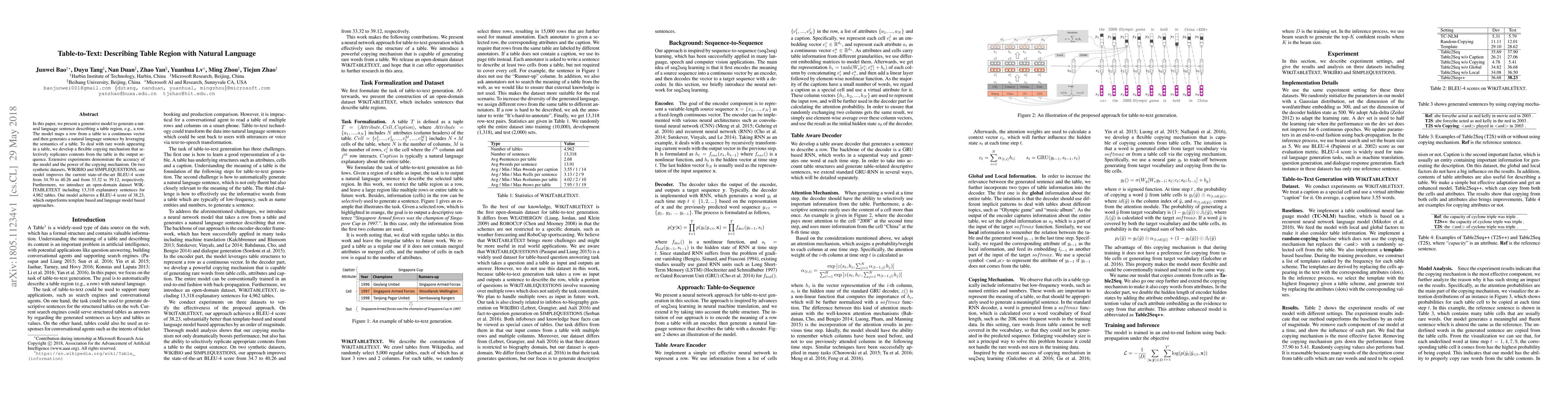 This paper introduces a generative model for converting table regions into natural language descriptions, improving accuracy through a flexible copying mechanism for rare words. The model achieves state-of-the-art results on multiple datasets, notably enhancing BLEU-4 scores and introducing a new open-domain dataset, WIKITABLETEXT.